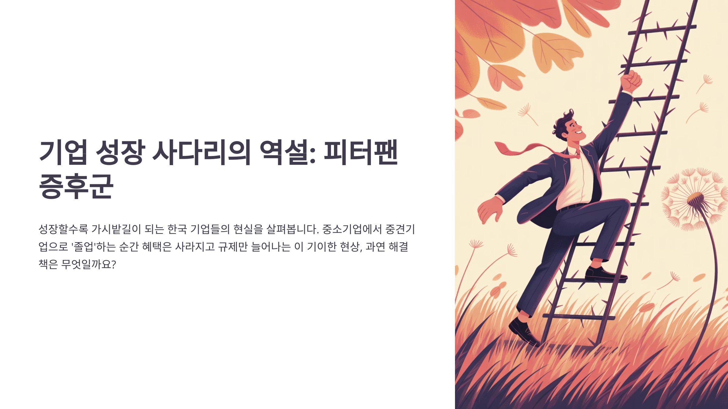 "우리 회사, 매출 1000억 찍었는데 왜 더 힘들어졌죠?" 2024년, 벤처기업에서 시작해 중소기업을 거쳐 당당히 중견기업으로 성장한 A사 대표님의 한숨 섞인 하소연은 남 일 같지 않습니다. 그동안 밤낮없이 뛰고 또 뛰어, 고용을 늘리고 투자하며 회사의 덩치를 키웠는데, 돌아온 건 정부의 따뜻한 박수 대신 차가운 규제와 혜택 박탈이라니! 마치 피터팬처럼 영원히 중소기업으로 남고 싶다는 웃픈 고백은, 과연 성장하는 기업에게 '징벌'을 내리는 이 기막힌 현실을 여실히 보여줍니다.