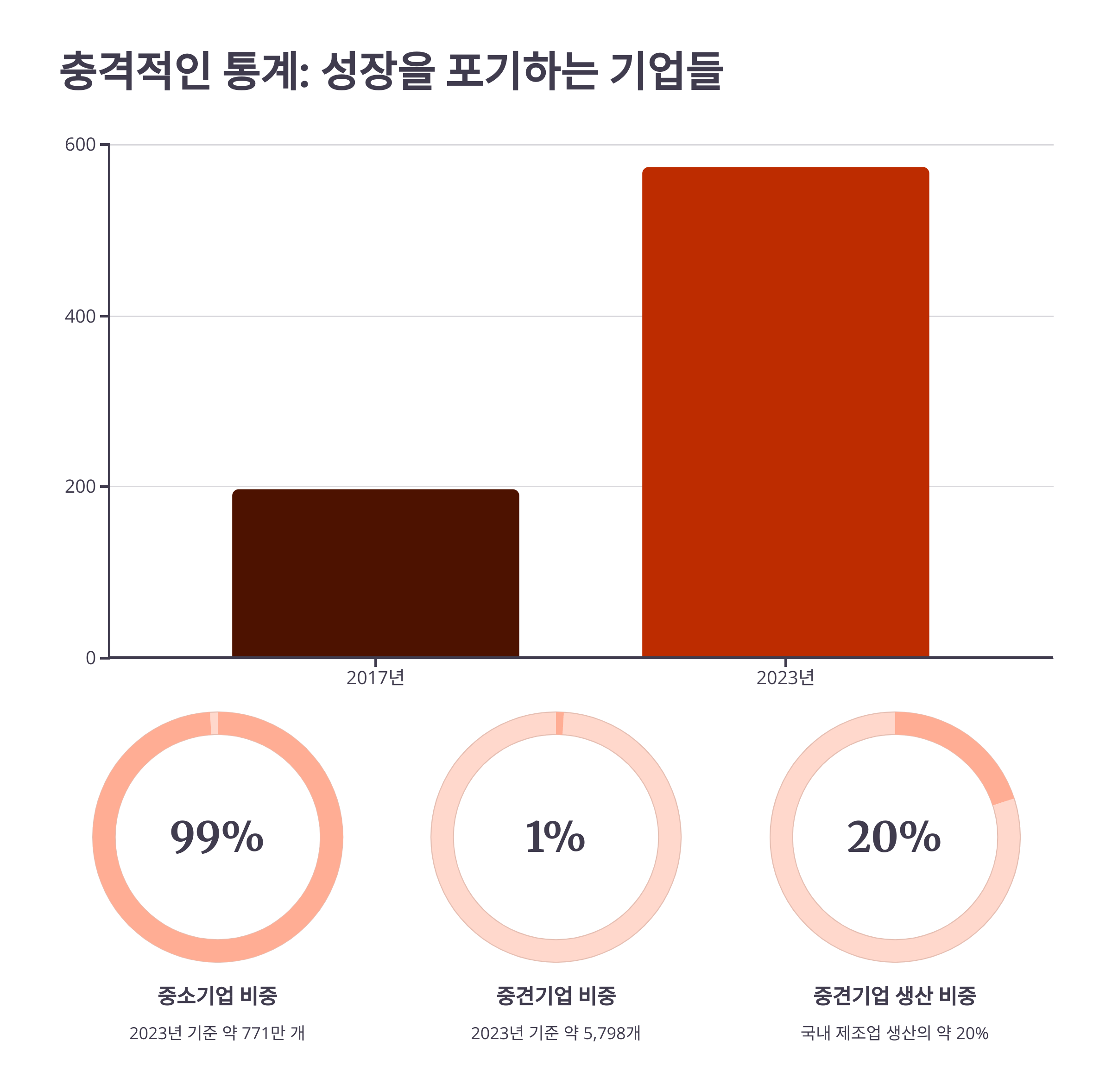 - 중소기업: 2023년 기준 약 771만 개. 국내 기업의 99%를 차지하며, 고용의 80%를 담당하는 경제의 뿌리입니다.