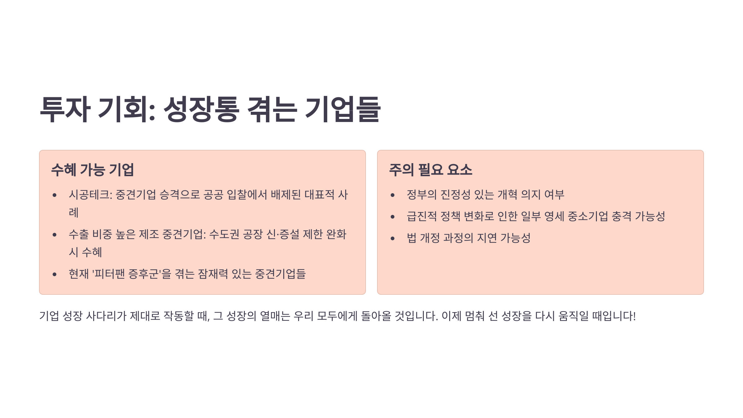 기업 성장 사다리가 제대로 작동하지 않는다는 것은 단순히 개별 기업의 문제가 아니라, 한국 경제 전체의 활력과 직결되는 문제입니다.