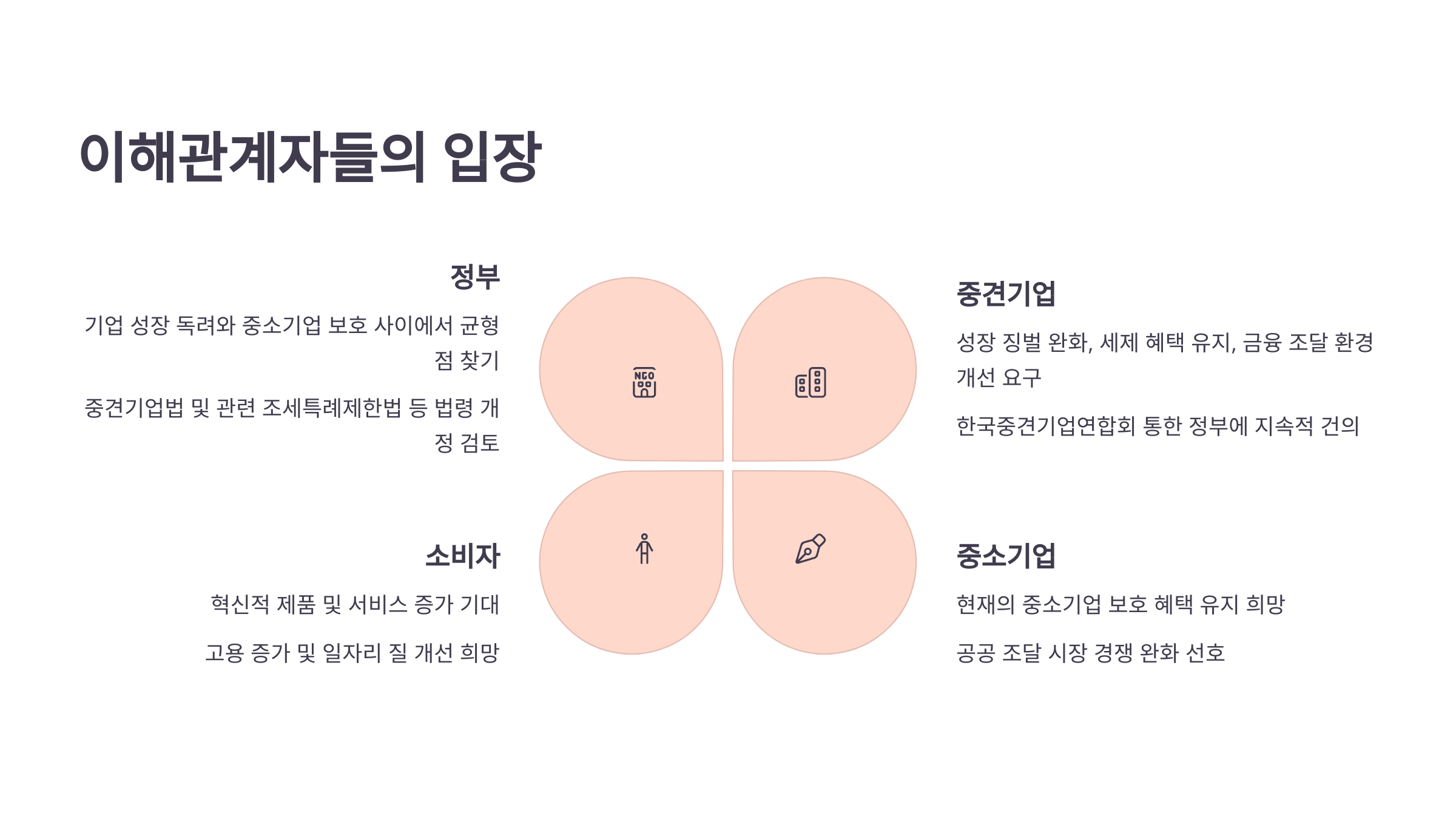- 관심사 및 요구사항: 기업 성장 독려, 고용 창출, 혁신 생태계 조성, 중소기업 보호.