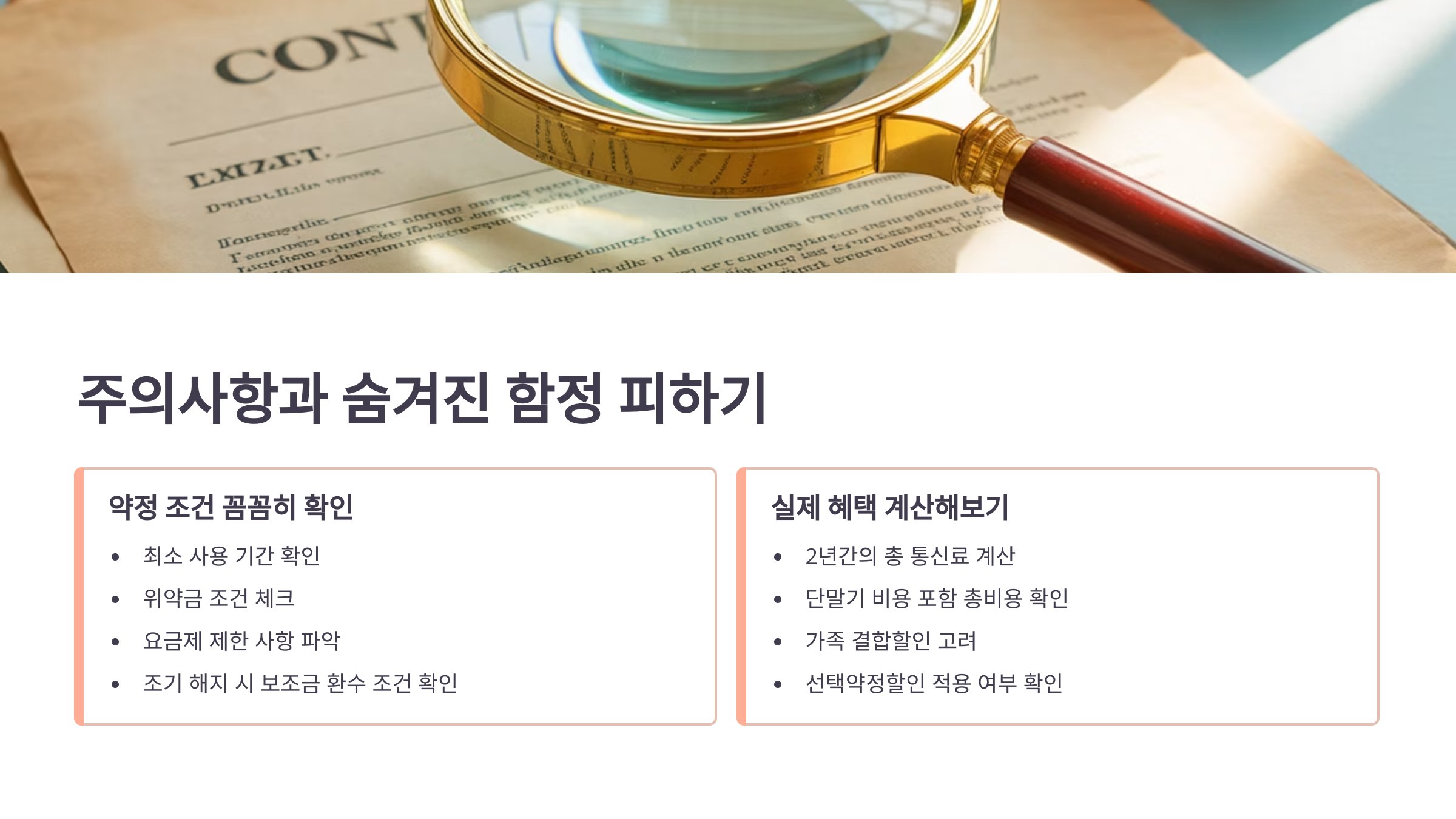 높은 보조금에는 반드시 조건이 따릅니다. 최소 사용 기간, 위약금, 요금제 제한 등을 사전에 명확히 확인해야 합니다. 특히 조기 해지 시 보조금 환수 조건을 반드시 체크해야 합니다.
