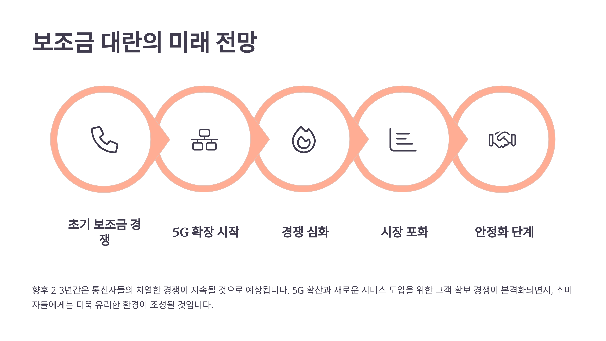 향후 2-3년간은 통신사들의 치열한 경쟁이 지속될 것으로 예상됩니다. 5G 확산과 새로운 서비스 도입을 위한 고객 확보 경쟁이 본격화되면서, 소비자들에게는 더욱 유리한 환경이 조성될 것입니다.