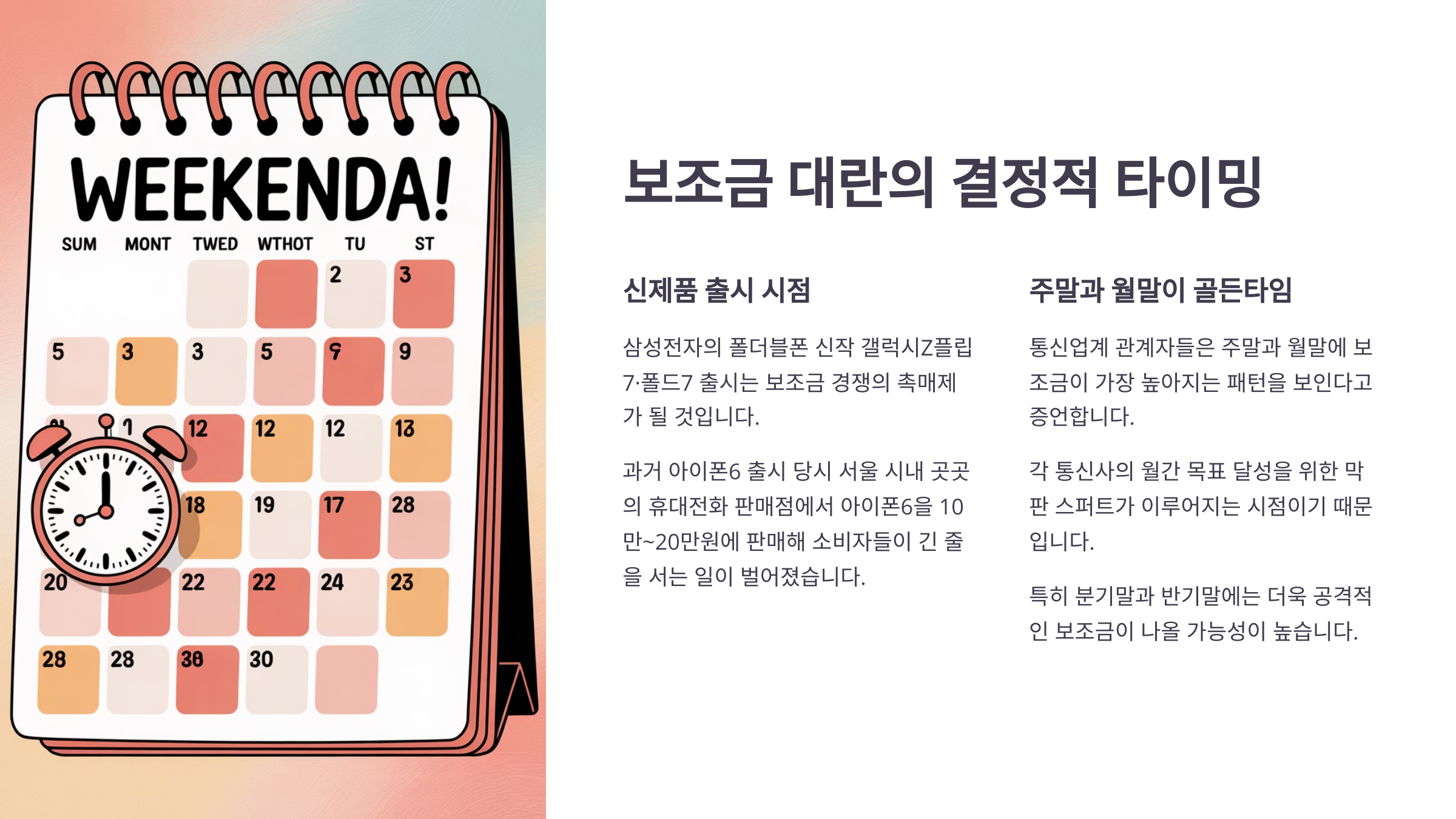 통신업계 관계자들은 주말과 월말에 보조금이 가장 높아지는 패턴을 보인다고 증언합니다. 각 통신사의 월간 목표 달성을 위한 막판 스퍼트가 이루어지는 시점이기 때문입니다. 특히 분기말과 반기말에는 더욱 공격적인 보조금이 나올 가능성이 높습니다.