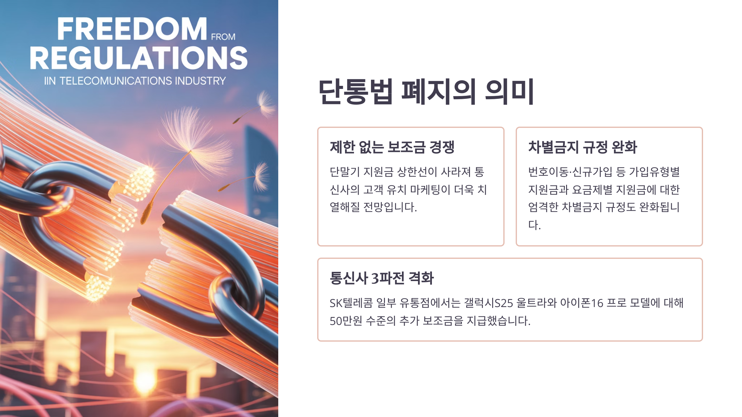 단통법이 폐지되면 단말기 지원금 상한선이 사라져 통신사의 고객 유치 마케팅이 더욱 치열해질 전망입니다. 그동안 공시지원금의 15% 이내로 제한되었던 추가 보조금 규제가 완전히 사라지면서, 통신사들은 이제 무제한 마케팅 경쟁에 돌입할 수 있게 되었습니다.