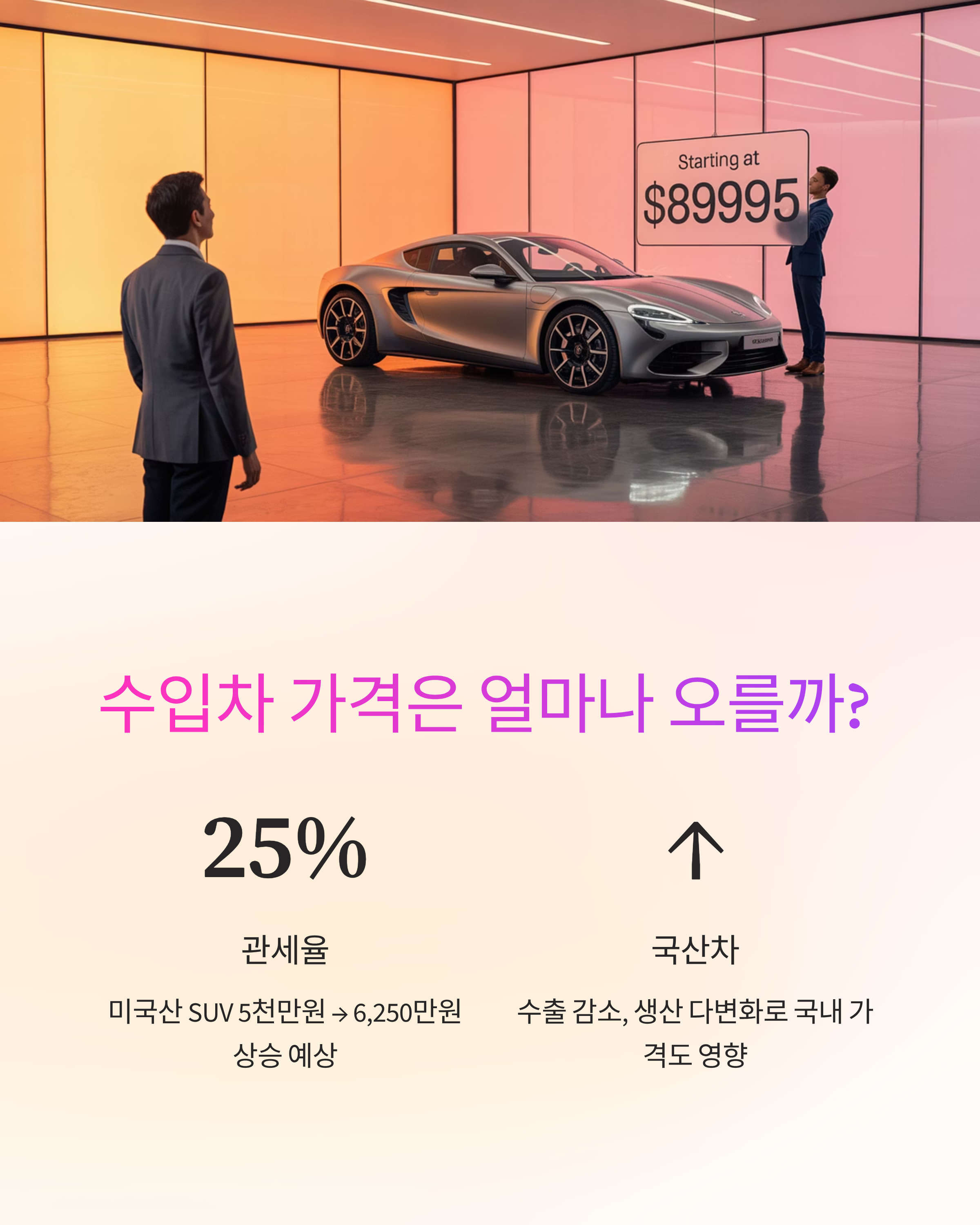 - 국산차 가격 변화: 국내에서 생산되지만 미국으로 많이 수출되는 국산차의 경우, 국내 판매 가격에도 간접적인 영향이 있을 수 있습니다. 수출 물량이 줄어들거나, 생산 기지 다변화에 따른 비용 증가가 국내 시장 가격에도 반영될 가능성이 있기 때문입니다.