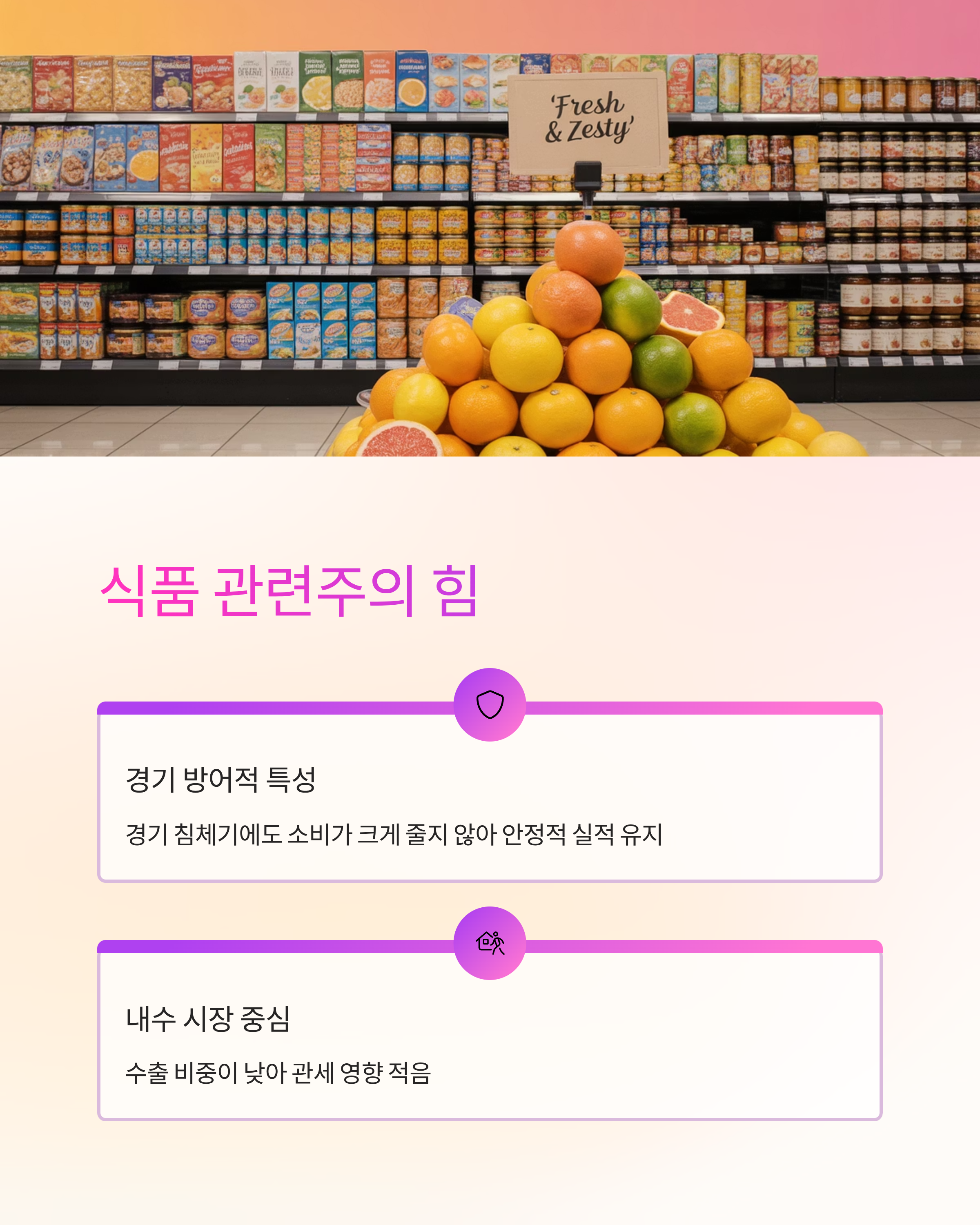 경기가 아무리 어렵고 국제 정세가 불안해도 사람들은 먹고살아야 합니다. 따라서 필수 소비재인 식품 산업은 비교적 경기 방어적인 특성을 가집니다. 보호무역주의로 인해 수입 식자재 가격이 상승하거나 공급이 불안정해지면, 오히려 국내 생산 식품 기업이나 안정적인 공급망을 갖춘 기업들이 강세를 보일 수 있습니다.