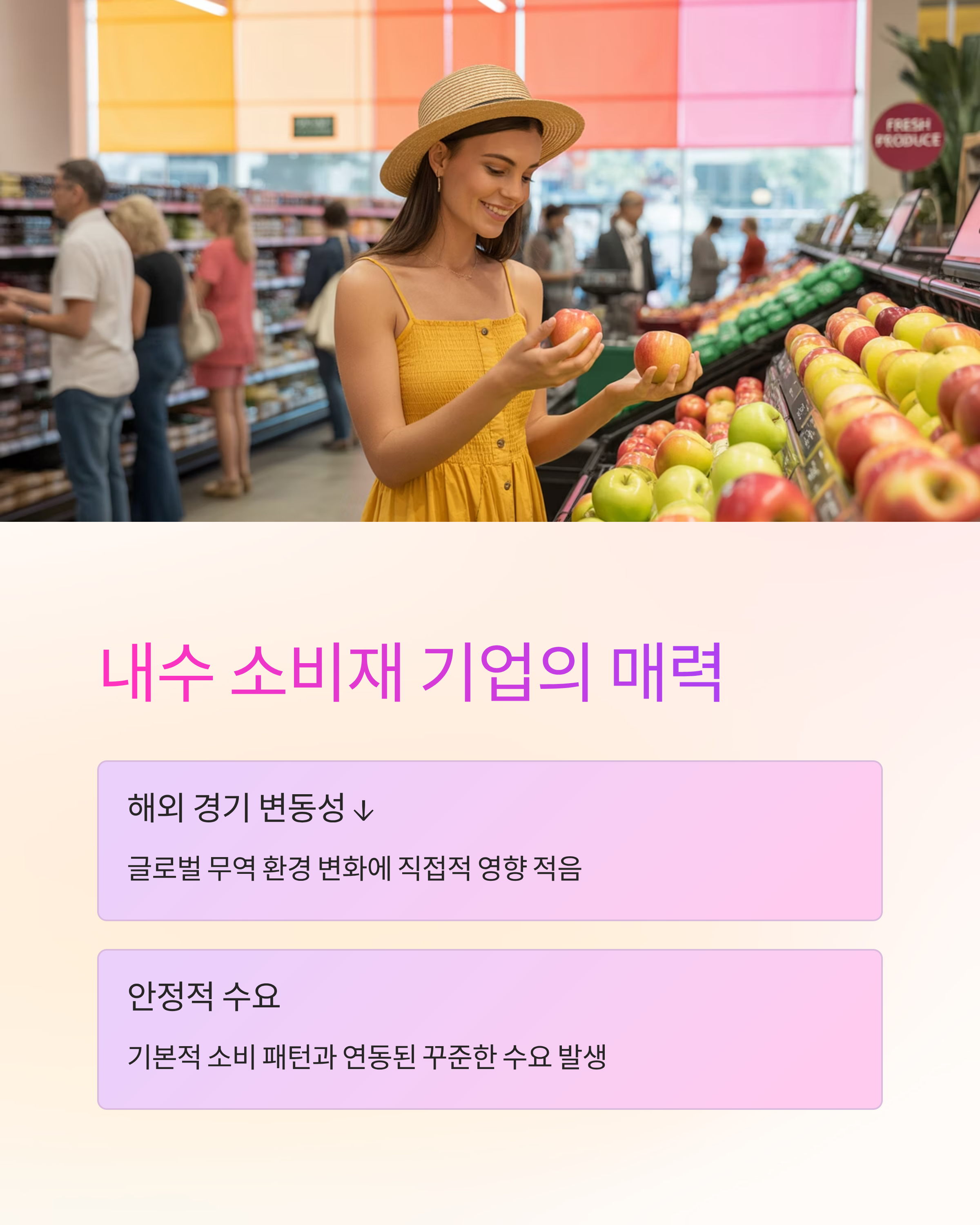 수출 기업들이 어려움을 겪는 동안에도, 국민들의 기본적인 의식주와 관련된 내수 소비재 기업들은 비교적 견조한 실적을 유지할 수 있습니다. 특히 경기가 어려워질수록 외부 활동을 줄이고 집에서 소비하는 '홈코노미' 관련 소비가 늘어나는 경향도 나타납니다.