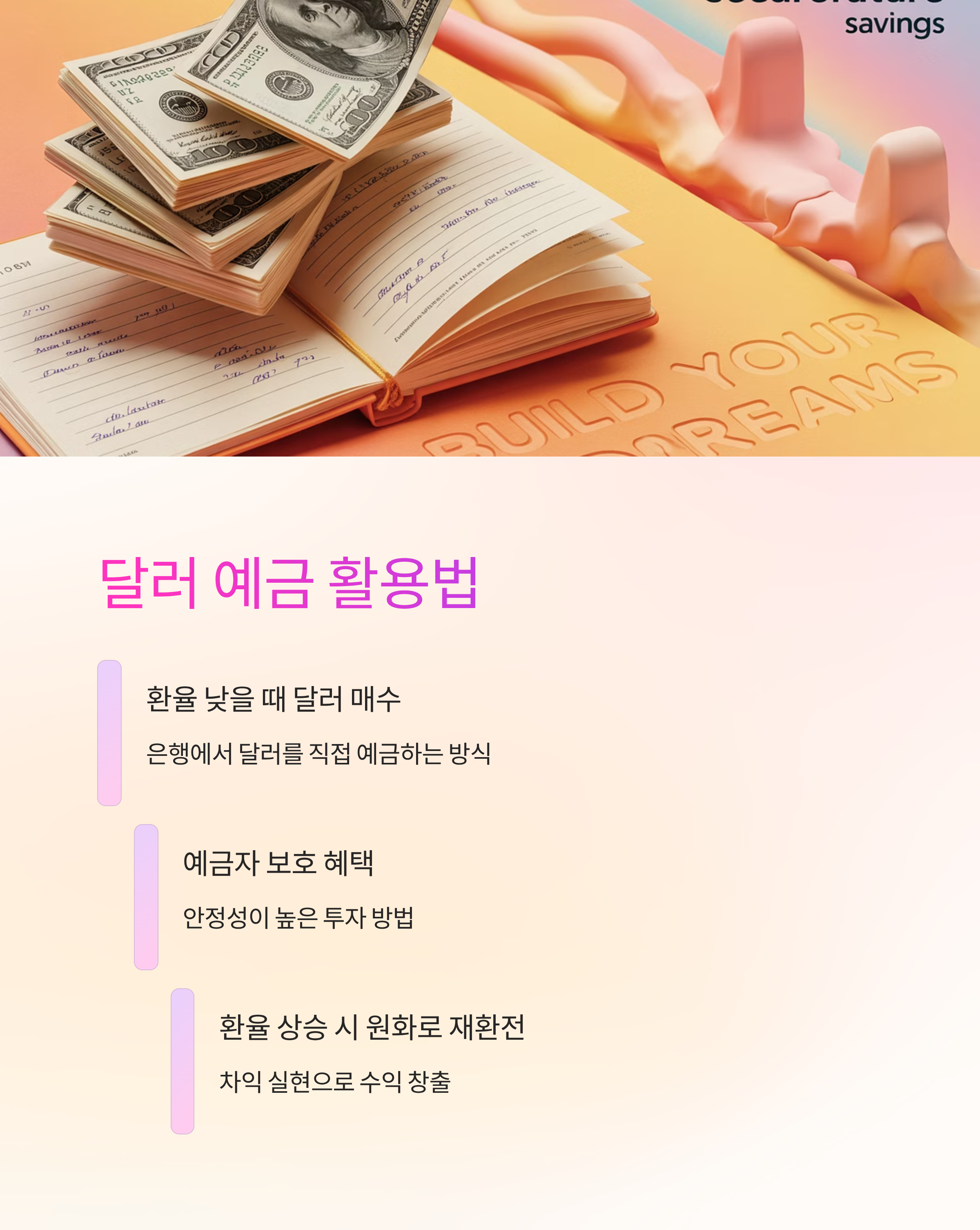 - 활용법: 환율이 낮을 때 달러를 매수하여 예금하고, 환율이 상승했을 때 원화로 재환전하여 차익을 얻습니다. 장기적인 관점에서 환율 방어 수단으로도 유용합니다.