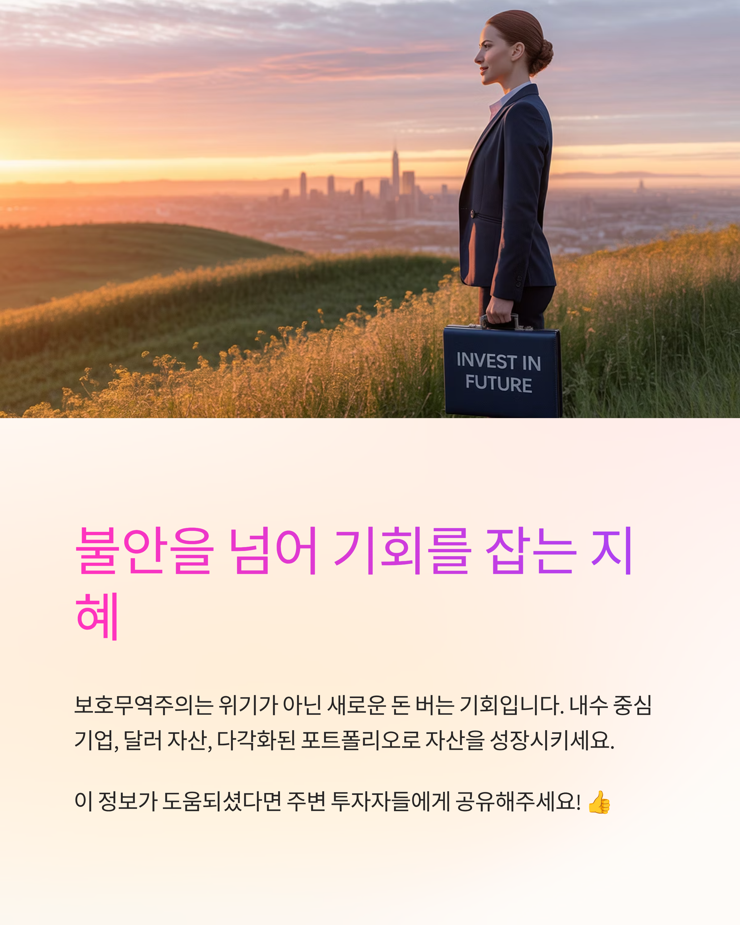 보호무역주의는 결코 쉽게 사라질 흐름이 아닙니다. 하지만 이러한 변화를 단순히 위기로만 받아들일 필요는 없습니다. 오히려 현명한 투자자에게는 새로운 돈 버는 기회가 될 수 있습니다. 내수 중심 기업, 방산주, 식품 관련주 등 성장 가능성이 높은 산업을 선별하고, 달러 자산 투자를 통해 환율 변동성을 활용하며, 다각화된 포트폴리오로 리스크 관리에 힘쓴다면, 당신의 자산은 보호무역의 파고 속에서도 굳건히 성장할 수 있을 것입니다.