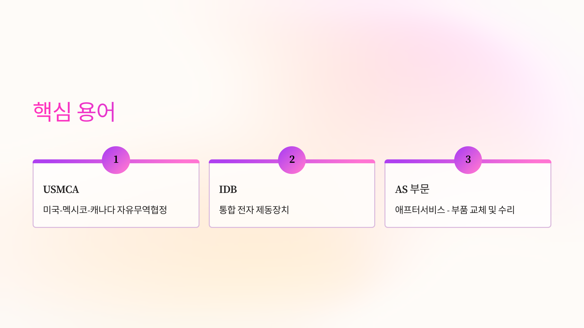 - USMCA (미국-멕시코-캐나다 자유무역협정): 기존 북미자유무역협정(NAFTA)을 대체하는 새로운 무역 협정입니다. USMCA는 역내 생산 및 부품 조달 기준을 강화하여 북미 지역 내 자동차 부품산업의 경쟁력 강화를 유도합니다. HL만도가 멕시코 공장 생산 덕분에 관세 영향을 덜 받은 이유가 바로 이 USMCA 규정 충족 덕분이며, 이는 향후 다른 자동차 부품기업들의 해외 생산 거점 전략에 큰 영향을 미칠 것입니다.