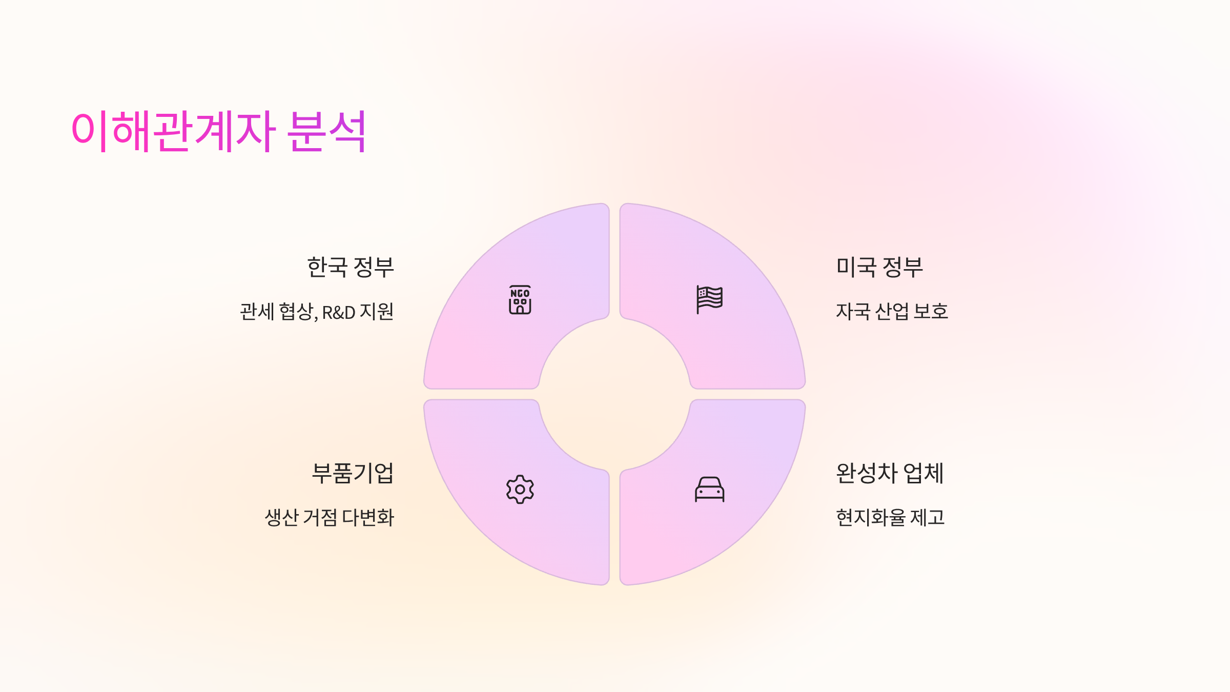미국 관세 폭탄과 자동차 부품산업의 변화는 다양한 이해관계자 그룹에게 각기 다른 영향과 요구사항을 발생시킵니다.