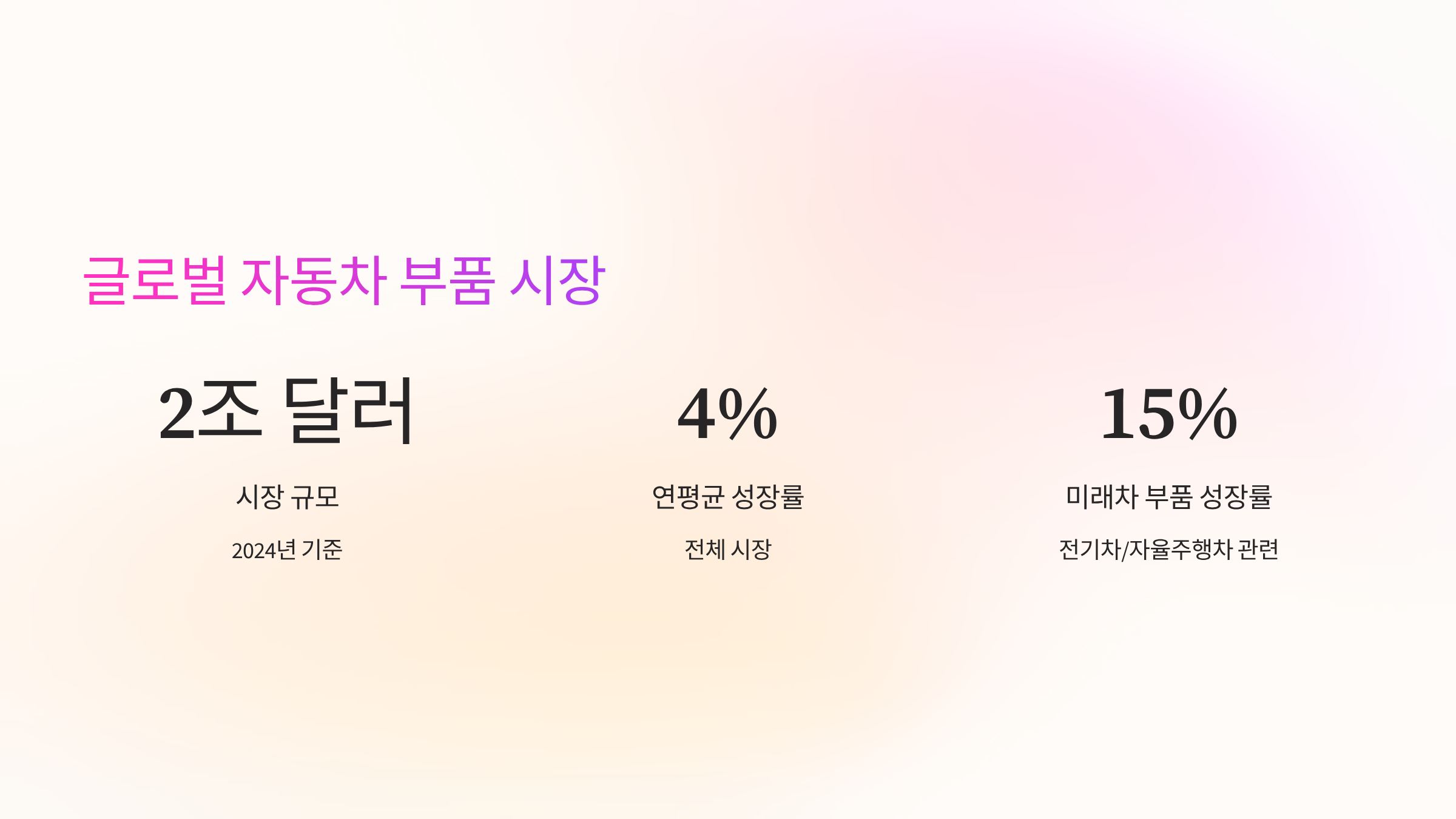 - 시장의 개념 및 규모: 자동차 부품산업은 완성차 생산에 필요한 다양한 부품(엔진, 변속기, 섀시, 전자 장치, 내외장재 등)을 생산, 공급하는 산업입니다. 글로벌 자동차 부품 시장 규모는 2024년 기준 약 2조 달러(한화 약 2,700조 원)에 달하며, 연평균 4% 이상의 꾸준한 성장이 예상됩니다. 특히 전기차 및 자율주행차 관련 부품 시장은 연평균 15% 이상 고성장이 기대되는 블루오션입니다.
