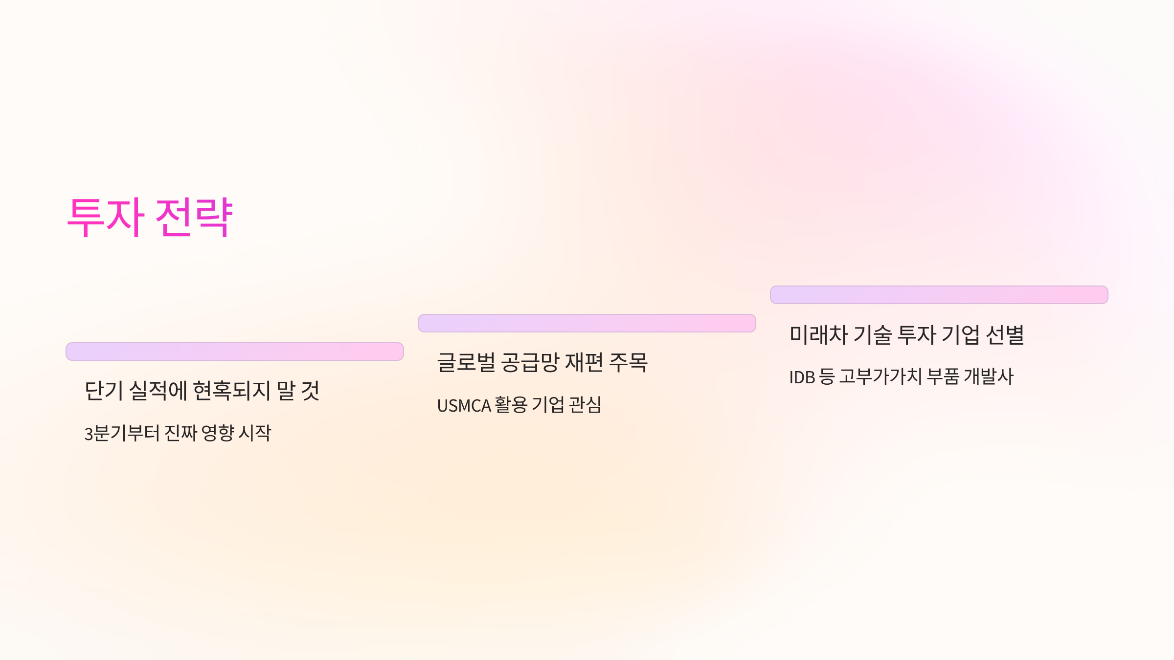 미국 관세는 단순히 무역 장벽을 넘어, 글로벌 공급망을 재편하고 미래차 산업의 전환을 가속화하는 촉매제가 될 것입니다. 이러한 변화 속에서 투자 기회는 분명 존재합니다. USMCA 규정을 활용하거나 미국 현지 생산을 확대하는 기업, 그리고 IDB와 같은 고부가가치 미래차 기술 부품 개발에 선제적으로 투자하는 기업들이야말로 관세 폭탄 속에서도 빛을 발할 수혜주가 될 것입니다.