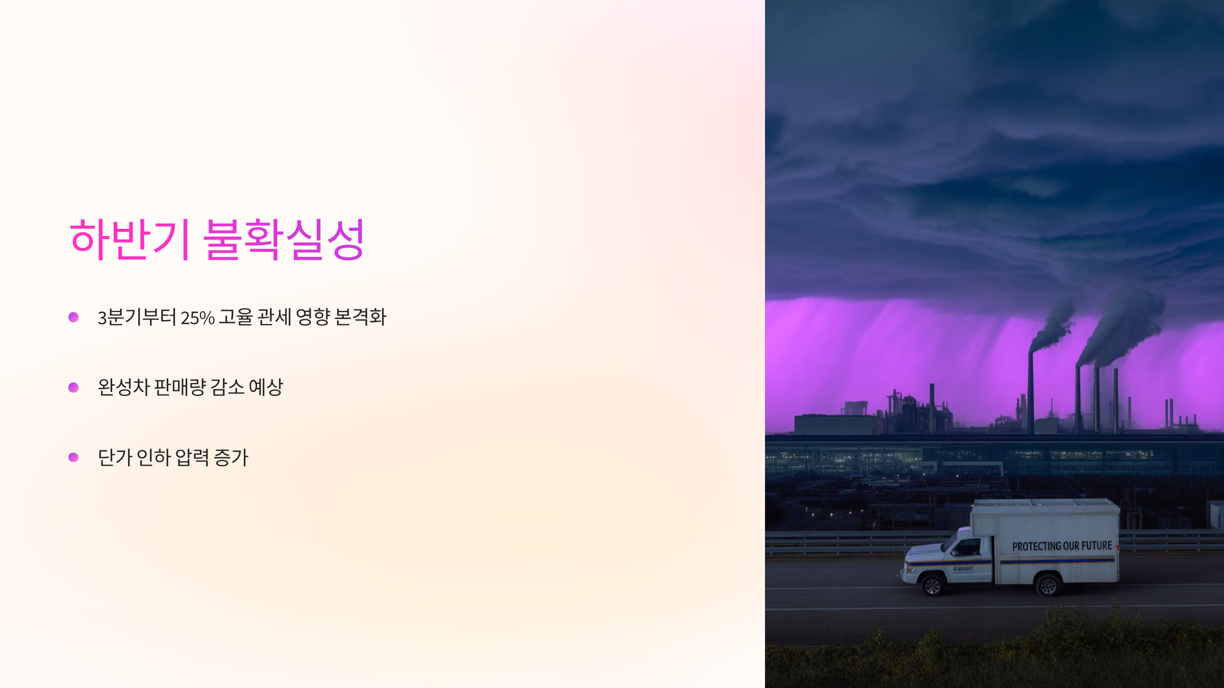 - 하반기 불확실성 증대: 문제는 3분기부터입니다. 25%의 고율 관세가 지속되면 완성차 판매량은 필연적으로 감소할 것이고, 이는 현대차·기아 등 완성차 업체의 단가 인하 압력으로 이어져 자동차 부품산업의 수익성을 크게 악화시킬 수 있습니다.