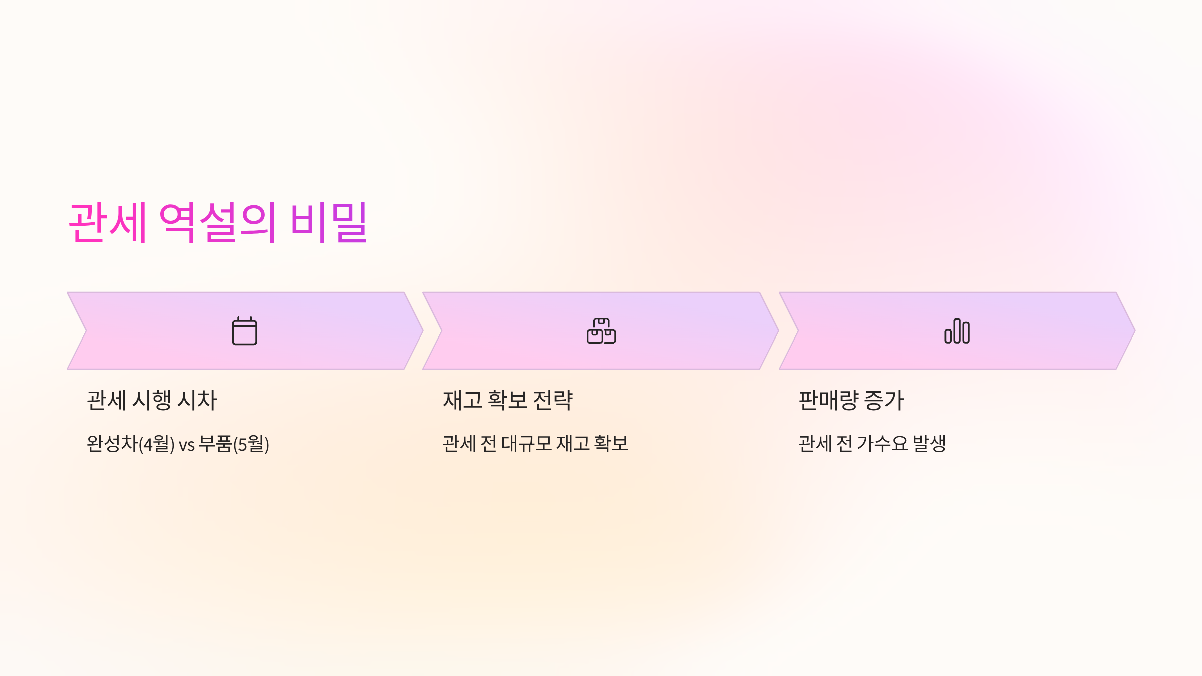 - 미국 관세 부과: 가장 큰 배경은 미국의 한국산 자동차 및 부품에 대한 고율 관세 부과입니다. 특히 완성차 관세(4월 2일 시행)와 부품 관세(5월 3일 시행) 간의 시차, 그리고 미국 내 생산 물량에 대한 부품 관세 2년 감액 조치가 이번 부품사들의 '일시적 선방'에 결정적인 영향을 미쳤습니다.