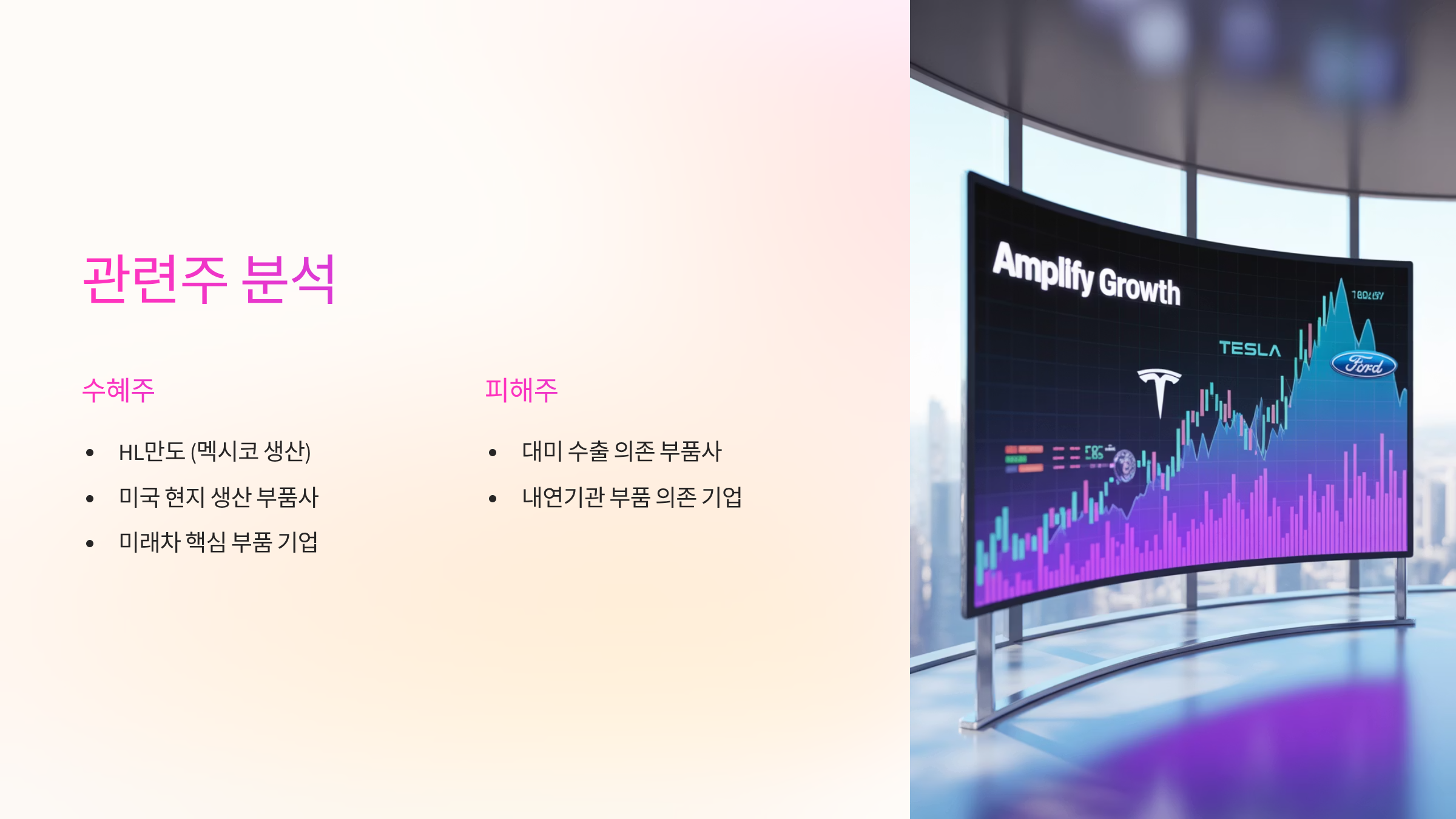 - 미국 현지 생산 비중이 높은 국내 부품사 (선정 이유): 미국 관세가 장기화될수록 미국 내 생산 비중이 높은 부품사들은 관세 부담에서 자유로워져 경쟁 우위를 확보할 수 있습니다. 관련 기업으로는 현대모비스의 미국 내 생산 시설 확충 계획에 주목할 필요가 있습니다. 이는 공급망 재편 과정에서 수혜를 입을 가능성이 높습니다.