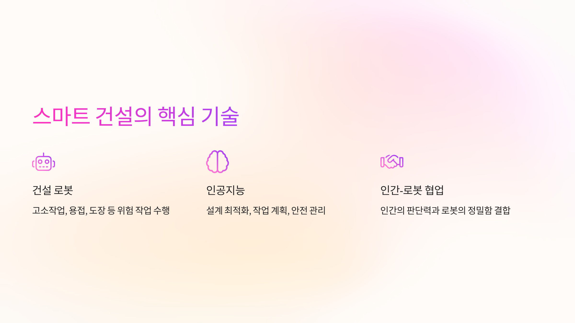 - 스마트 건설 (Smart Construction): 로봇, 인공지능(AI), 빅데이터, IoT(사물인터넷), BIM(건설정보모델링), 드론 등 첨단 기술을 건설 현장에 접목하여 생산성을 높이고, 안전성을 확보하며, 비용을 절감하는 혁신적인 건설 방식입니다. 설계부터 시공, 유지보수까지 전 과정에 걸쳐 디지털 기술을 활용하는 것이 특징입니다. 왜 주목을 받고 있는가? 인력난, 생산성 저하, 안전 문제 등 기존 건설업의 고질적인 문제를 해결하고, 새로운 고부가가치 시장을 창출할 수 있는 유일한 대안으로 평가받기 때문입니다. 향후 어떤 방향으로 전개될까? 단순히 기술 도입을 넘어, 인간-로봇 협업 시스템처럼 인간의 역량을 보완하고 강화하는 방향으로 발전하며, 우주, 심해, 극지 등 극한 환경으로 그 영역을 확장할 것입니다.
