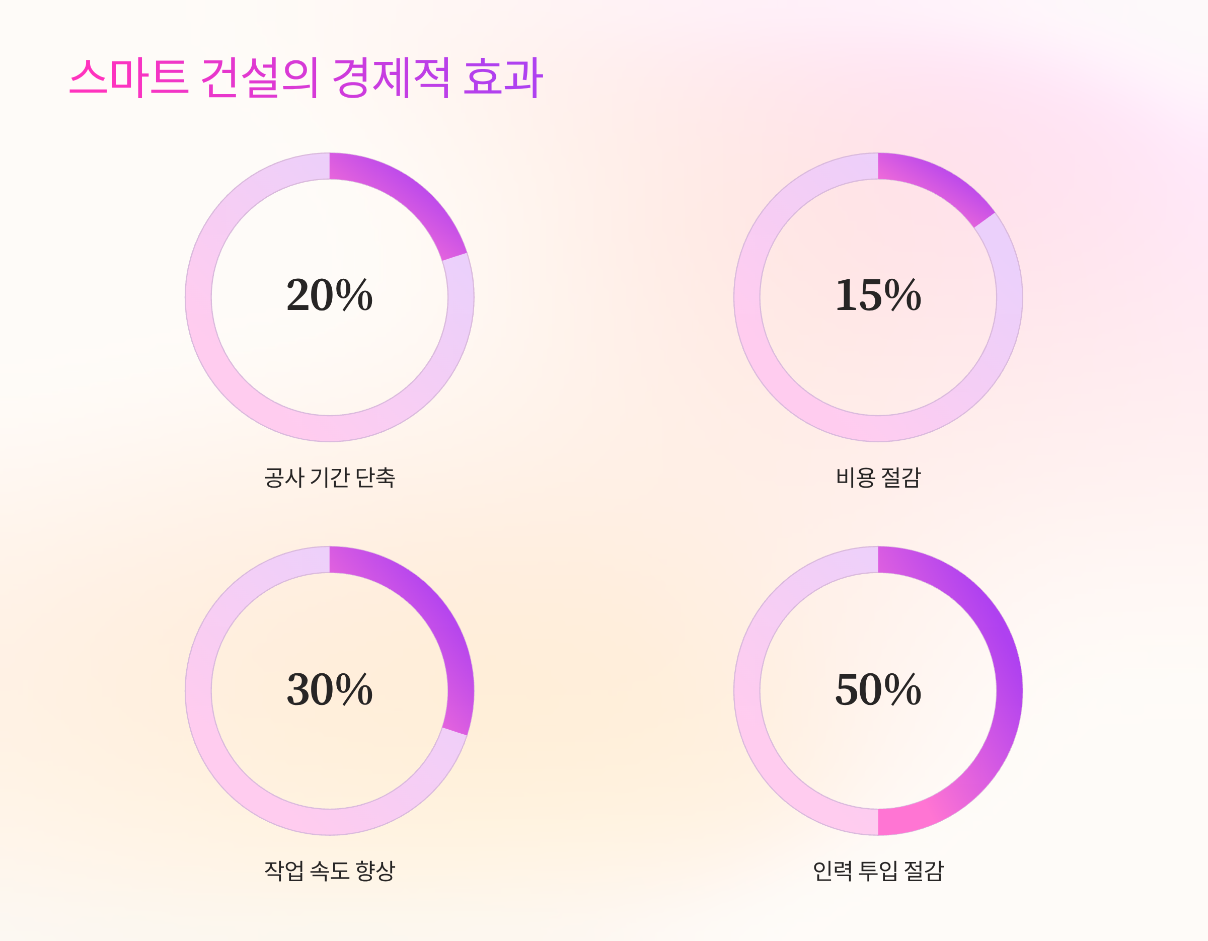 - 생산성 혁신과 비용 절감: 스마트 건설 기술은 건설 현장의 생산성을 획기적으로 높이고, 인건비와 공사 기간 단축을 통해 비용 절감 효과를 가져올 것입니다. 전문가들은 스마트 건설 기술 도입 시 최대 20%의 공사 기간 단축과 15%의 비용 절감 효과를 기대합니다.