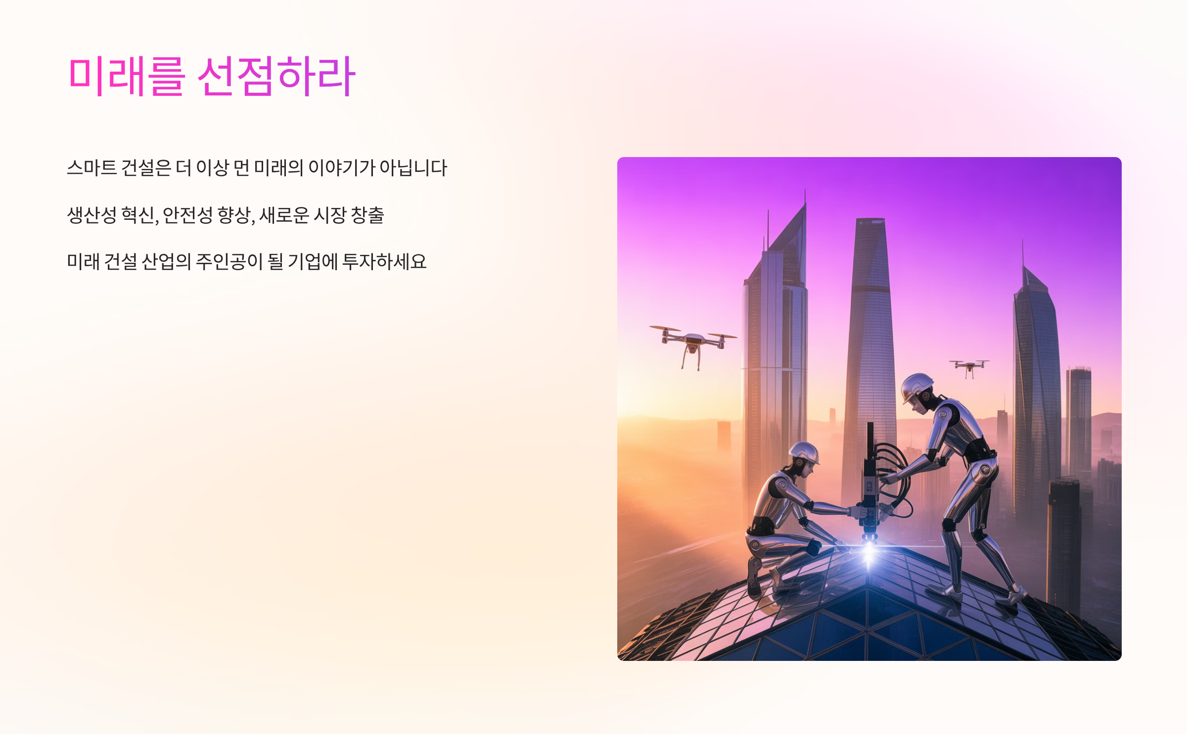 - 선정 이유: 미래 건설 시장의 새로운 영역을 개척하며, 높은 기술력과 원천 기술을 기반으로 한 독점적인 지위를 확보할 수 있습니다.