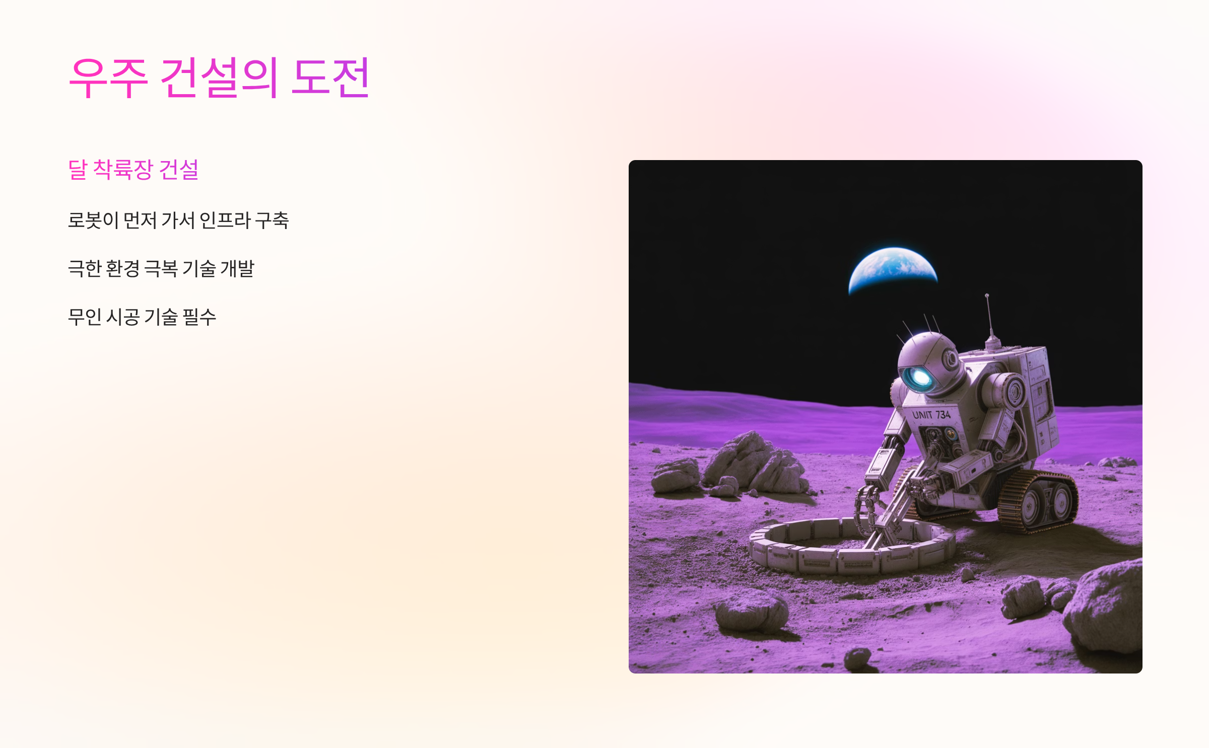 - 더 좋아진 점 (실증적 데이터 및 실전 적용사례): 연구진은 달 착륙장(랜딩패드)과 기본 도로 시공 기술을 개발하며, 달 표면 모사 시험시설에서 이를 검증했습니다. 이 시설은 실제 달 환경과 유사한 조건에서 로봇이 작동하고 건설 재료가 반응하는지 확인합니다. 이는 우주 탐사 로봇과 물류 운반 로봇이 안정적으로 이동하고 임무를 수행할 수 있는 기반을 마련하며, 궁극적으로 우주에서의 생존과 발전을 위한 필수적인 인프라를 구축하는 데 기여합니다.