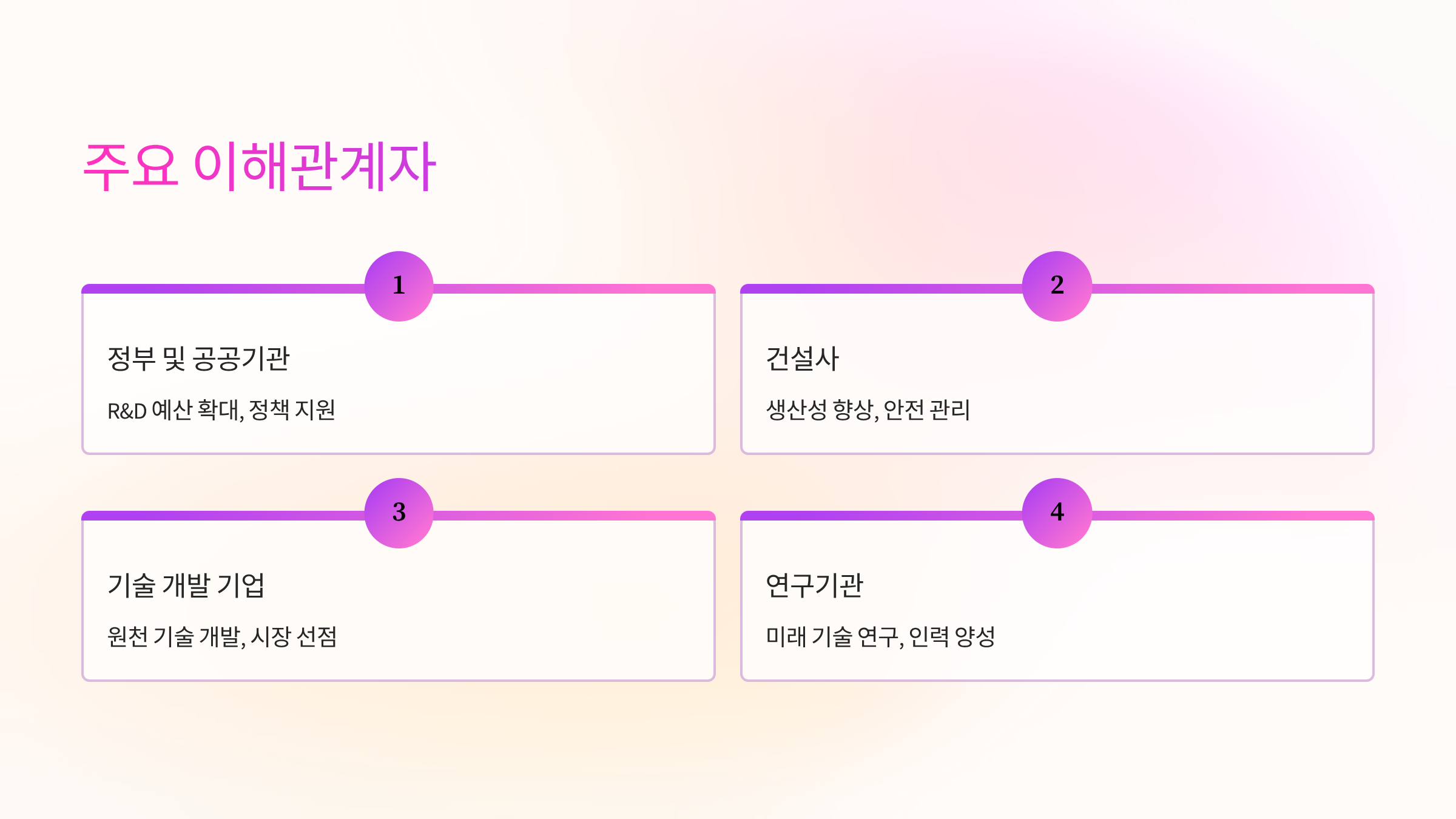 스마트 건설이라는 거대한 변화는 다양한 이해관계자 그룹에게 각기 다른 관심사와 요구사항을 발생시키고, 이들이 협력하거나 혹은 경쟁하며 미래 건설 산업의 지형을 만들어갈 것입니다.
