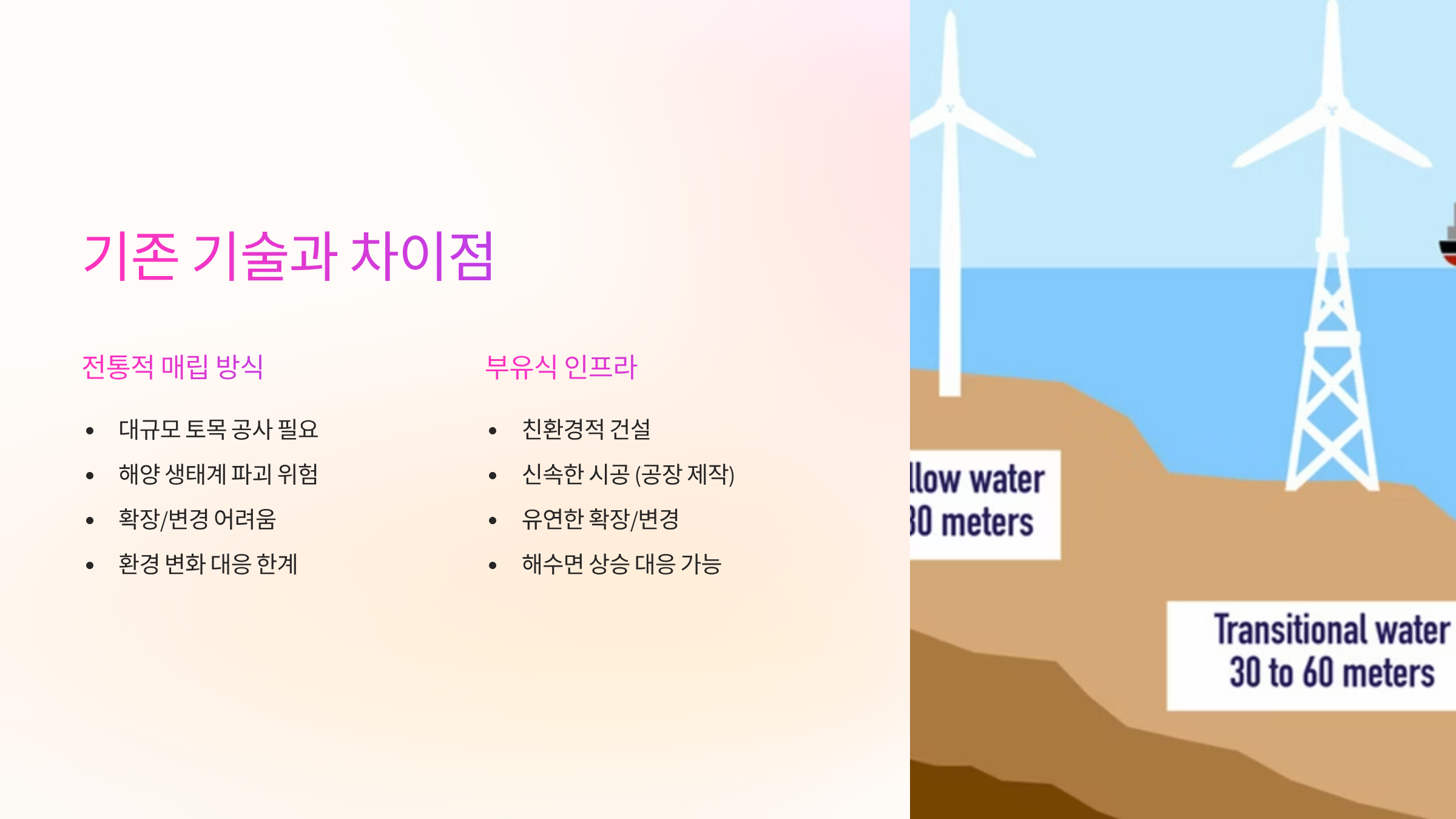 - 친환경적 건설 방식: 매립 방식을 대체하여 해양 생태계에 미치는 영향을 최소화하고, 재활용 가능한 모듈러 구조를 활용함으로써 지속 가능한 건설을 실현하는 데 기여합니다. 이는 ESG 경영을 중시하는 기업과 투자자들에게 매력적인 요소가 될 것입니다.
