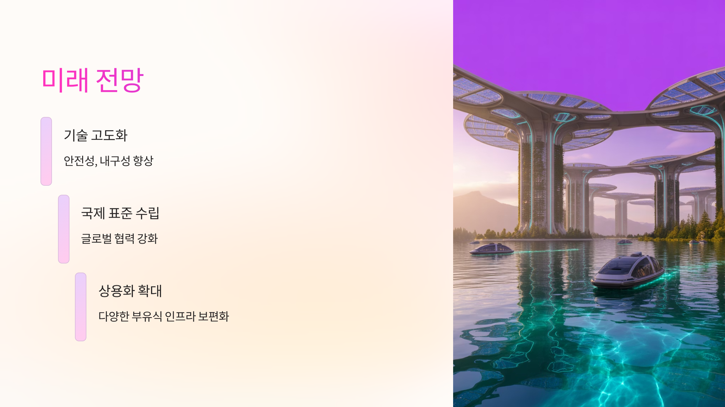 - 환경 문제: 친환경적이라고는 하지만, 대규모 부유식 인프라 건설 시 해양 생태계에 미칠 수 있는 잠재적 영향에 대한 지속적인 모니터링과 관리가 필요합니다.