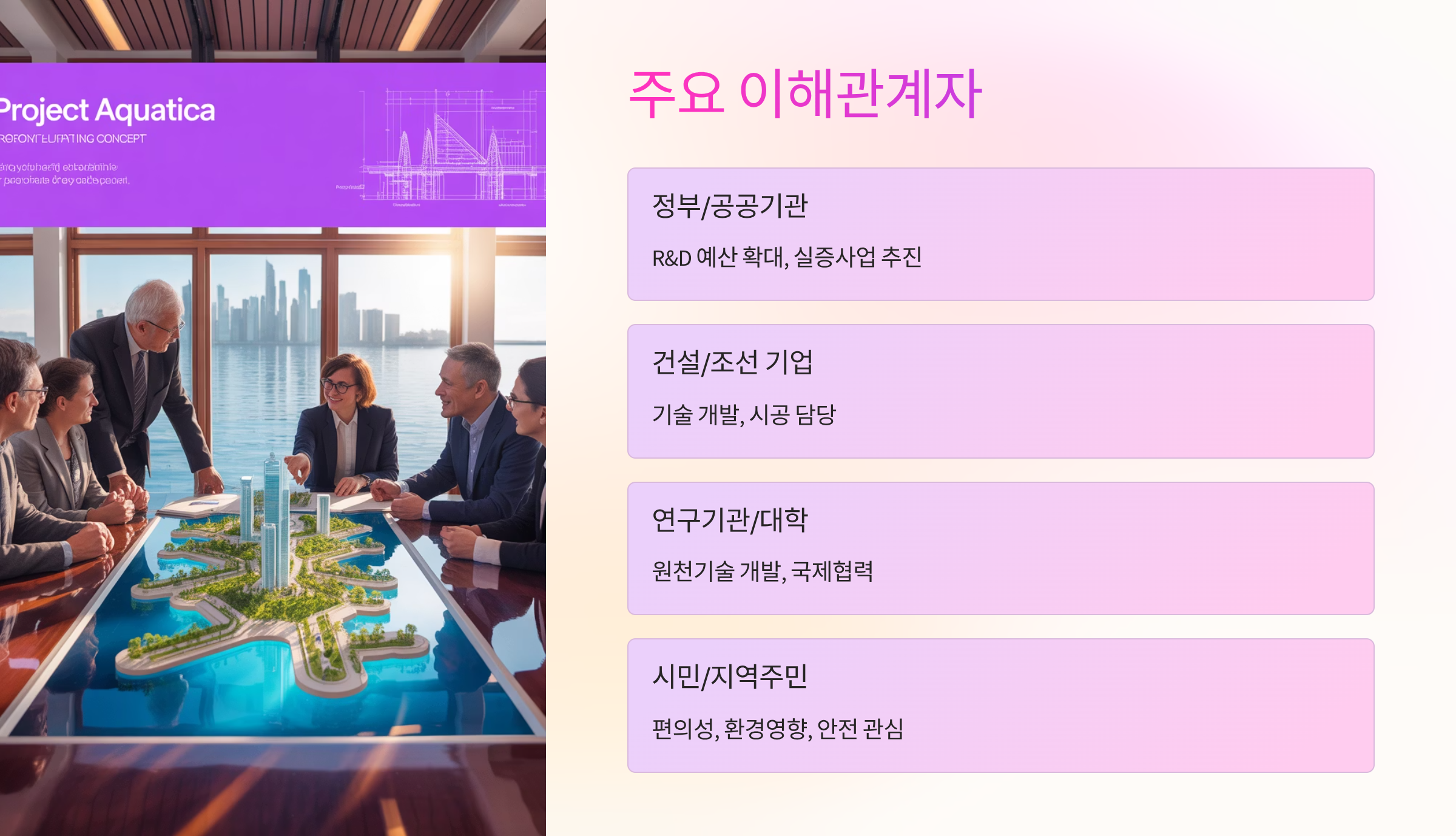 부유식 인프라라는 새로운 패러다임은 다양한 이해관계자 그룹에게 각기 다른 관심사와 요구사항을 발생시키며, 이들이 협력하거나 혹은 경쟁하며 미래 도시의 모습을 만들어갈 것입니다.
