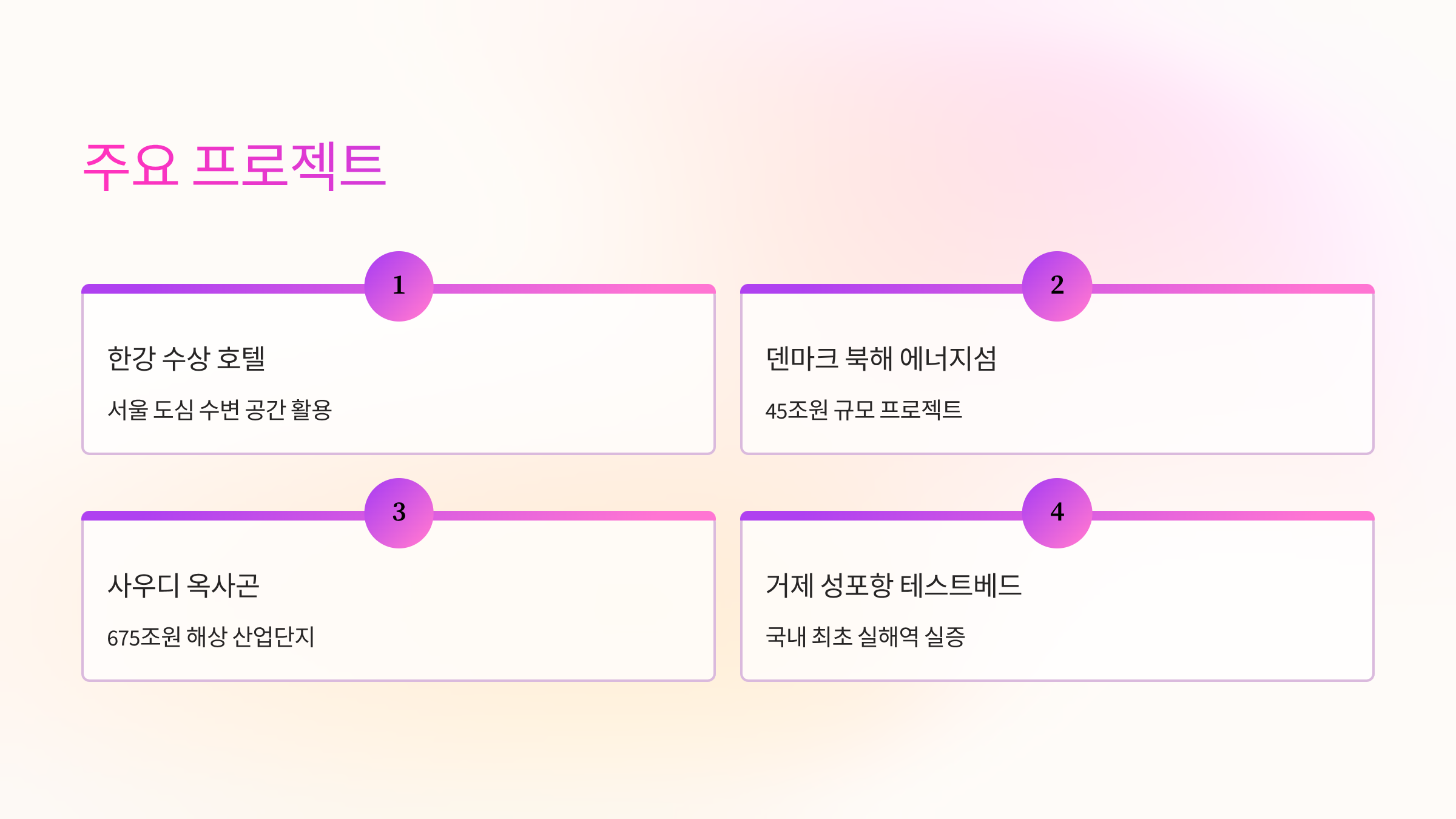 - 수치화된 내용: 덴마크의 북해 에너지섬 프로젝트는 약 300억 유로(한화 약 45조 원) 규모이며, 사우디아라비아의 옥사곤 프로젝트는 약 5,000억 달러(한화 약 675조 원) 규모에 달하는 등 세계적으로 부유식 인프라에 대한 투자가 급증하고 있습니다. 이는 부유식 인프라 시장의 폭발적인 성장 잠재력을 시사합니다.