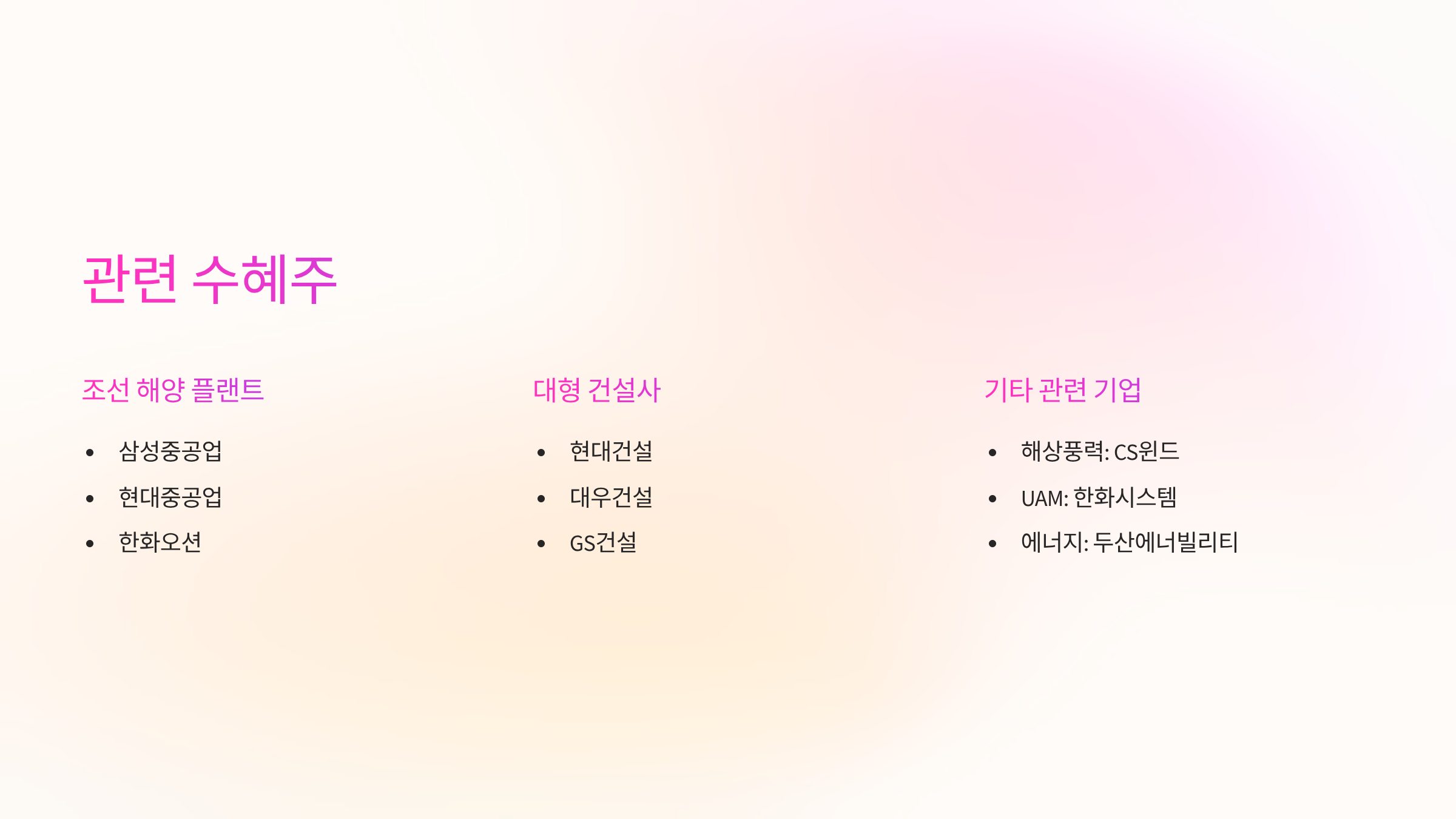 - 대형 조선 해양 플랜트 기업 (삼성중공업, 현대중공업, 한화오션 등): 부유식 인프라는 기본적으로 해상 구조물 건조 기술을 필요로 하므로, 대형 해양 플랜트 건설 경험이 풍부한 조선사들이 직접적인 수혜를 입을 것입니다. 특히 부유식 해상풍력 및 SMR 분야에서 강점을 가질 수 있습니다.