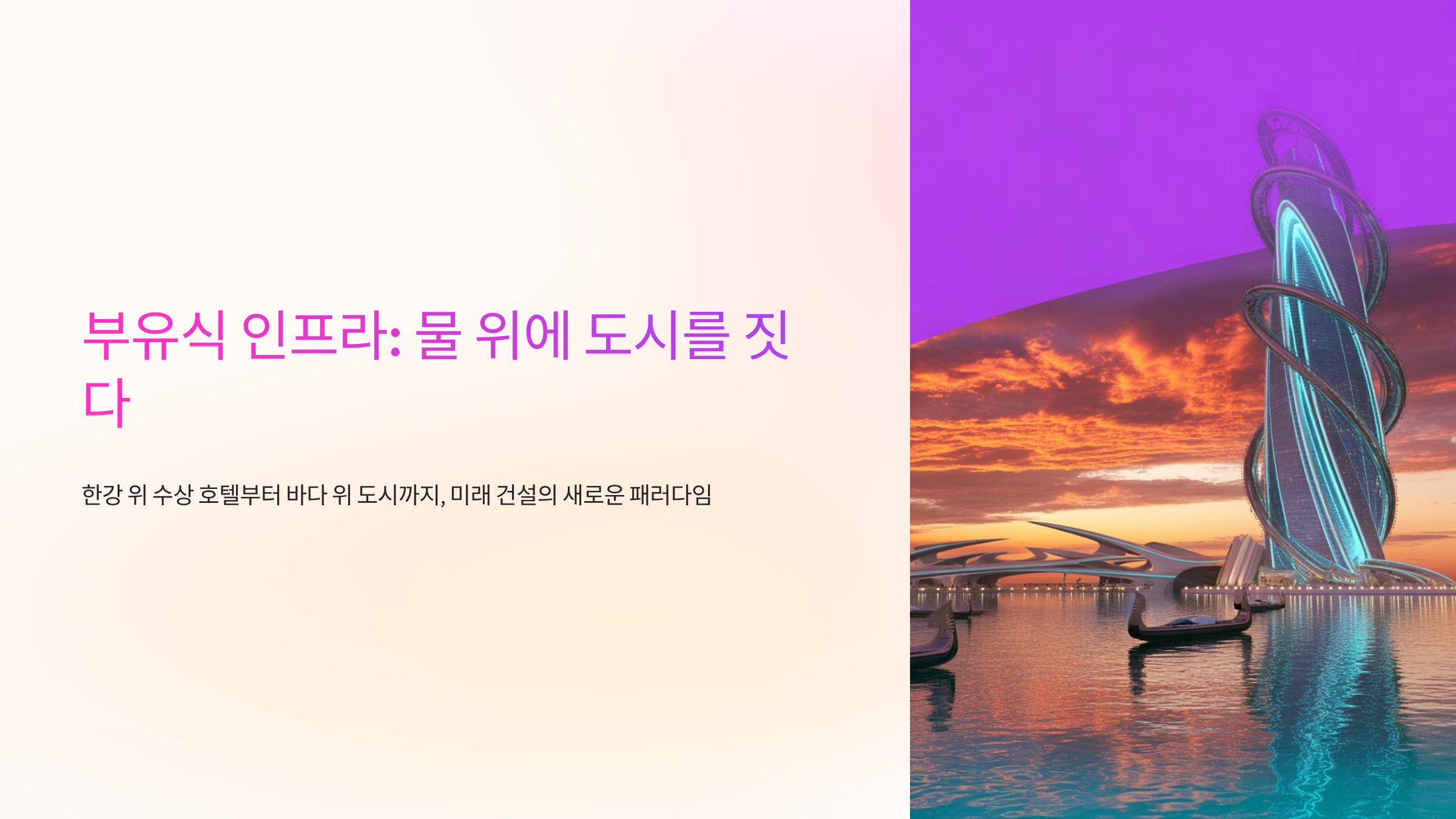 물 위에 뜨는 부유식 인프라가 이제는 단순한 상상을 넘어 UAM 이착륙장, 풍력발전, 심지어 수상 호텔과 오피스까지 현실로 만들어낼 차세대 미래 건설 기술로 떠오르고 있기 때문입니다. 덴마크의 해상풍력 인공섬, 사우디아라비아의 첨단 해상 산업단지처럼 이미 전 세계는 바다 위 도시를 향한 거대한 물결을 일으키고 있습니다. 과연 이 혁명적인 기술이 우리 삶과 투자 시장에 어떤 변화를 가져올지 궁금하지 않으신가요?