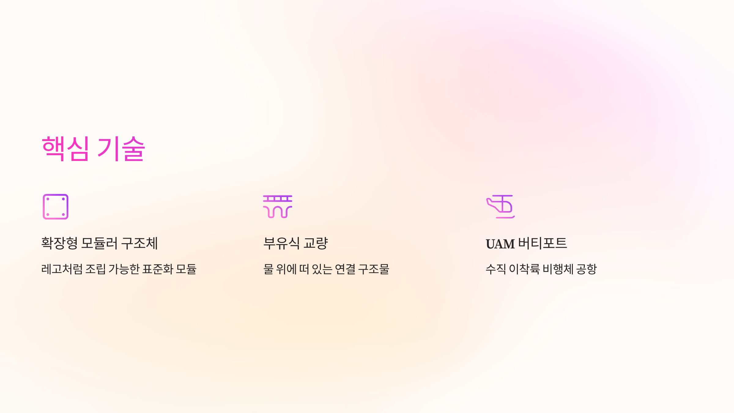 - UAM (Urban Air Mobility) 버티포트: 도심항공교통(UAM), 즉 하늘을 나는 택시나 드론 택시 등이 이착륙할 수 있도록 설계된 시설을 의미합니다. '버티포트'는 수직 이착륙 비행체를 위한 공항이라고 생각하면 됩니다. 왜 주목을 받고 있는가? 도심의 교통 체증을 해소하고 새로운 이동 수단을 제공할 UAM의 상용화를 위해서는 도심 내 효율적인 이착륙 공간 확보가 필수적인데, 부유식 인프라를 활용한 수상 버티포트는 소음, 안전, 공간 제약 문제를 해결할 수 있는 혁신적인 대안으로 주목받고 있습니다. 향후 어떤 방향으로 전개될까? 한강과 같은 도심 수면에 건설되어 실제 UAM 서비스의 핵심 인프라가 될 것입니다.