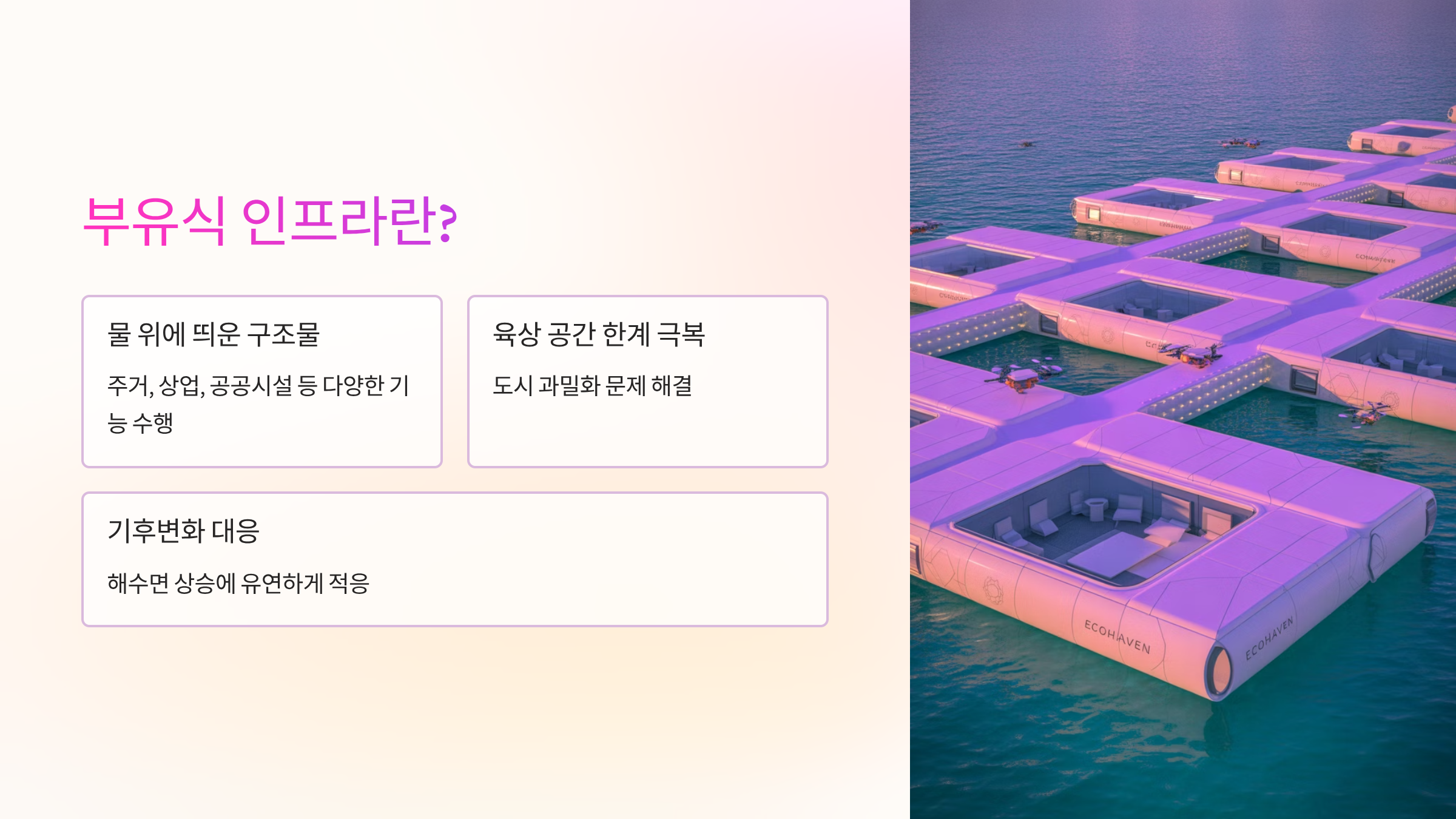 부유식 인프라는 기존 건설 방식의 한계를 뛰어넘어 환경 변화에 적응하고 새로운 공간을 창출하는 혁신적인 기술과 방법을 제시합니다.