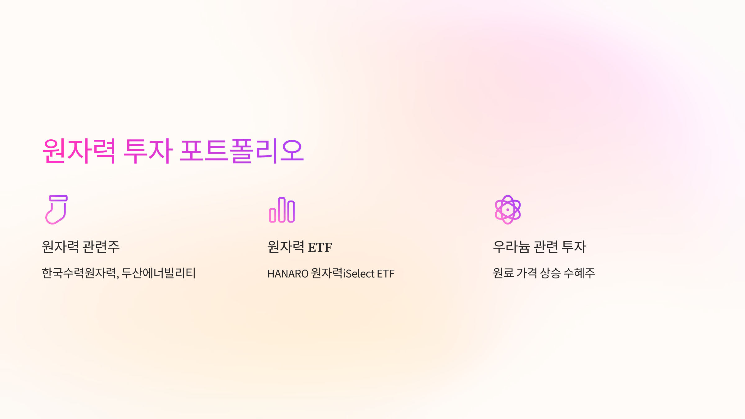 - 원자력 ETF: HANARO 원자력iSelect ETF 같은 상품으로 리스크를 분산하면서 원자력 섹터 전체에 투자