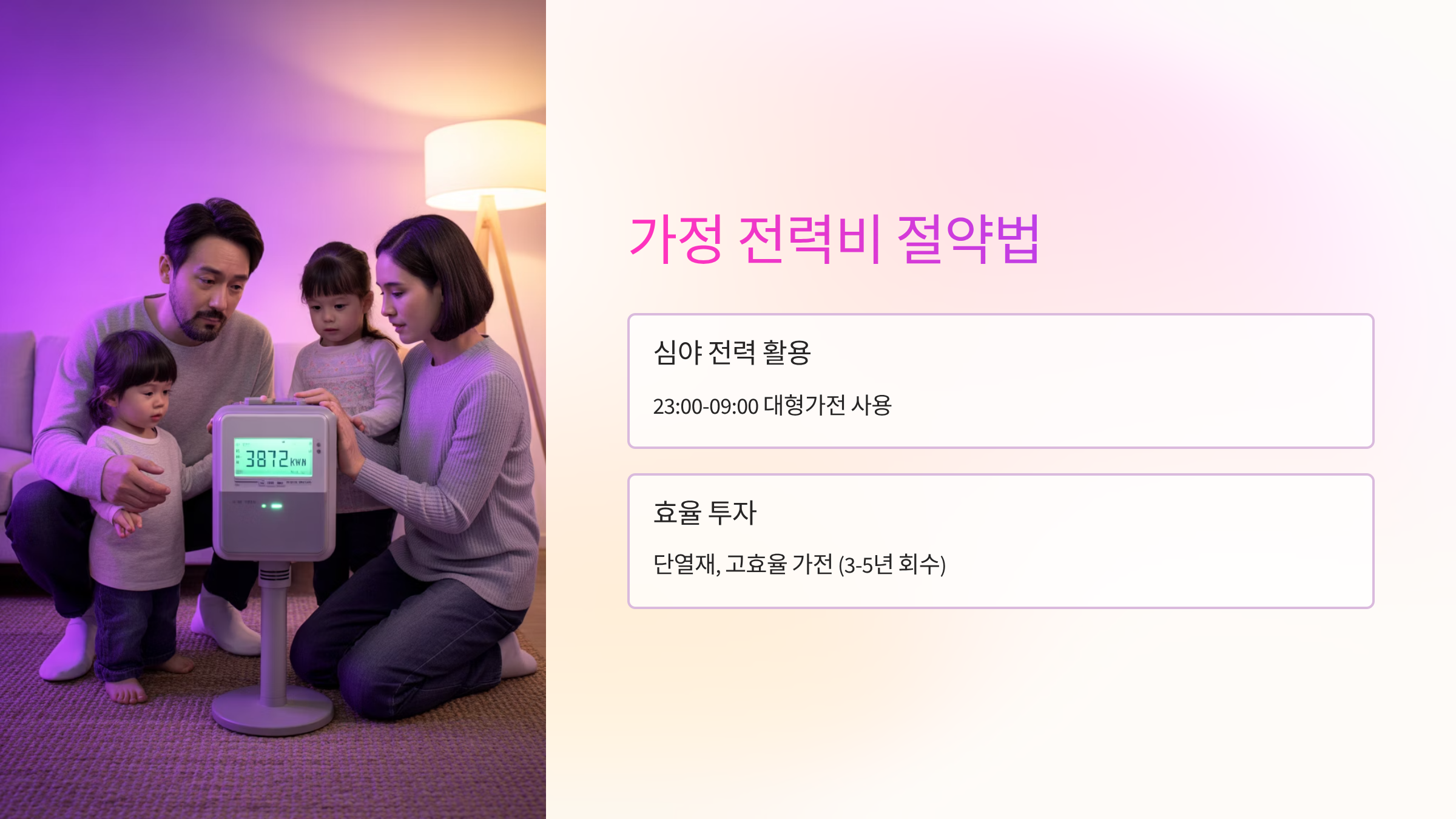 현재의 전력요금 체계를 이해하고 원자력 발전 비중이 높은 시간대를 활용하면 월 전기요금을 20-30% 절약할 수 있습니다. 특히 심야시간대(23:00-09:00)에 세탁기, 식기세척기 등 전력 소모가 큰 가전제품을 사용하면 상당한 비용 절감 효과를 볼 수 있습니다.