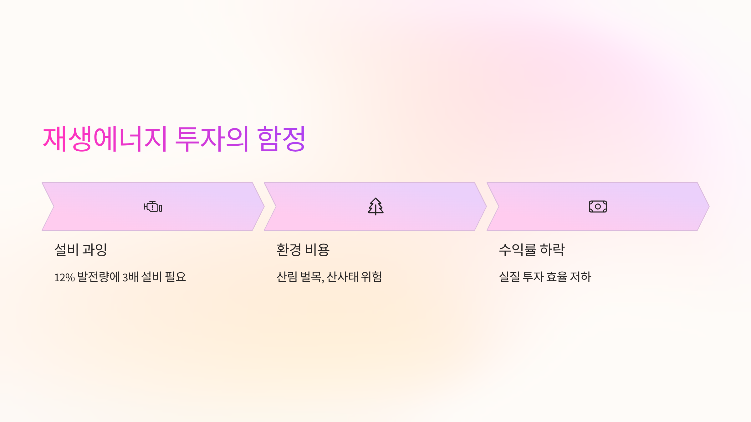 태양광 발전의 경우, 설치를 위해 산림을 벌목하는 과정에서 발생하는 환경 비용과 산사태 위험성까지 고려하면, 실질적인 투자 수익률은 더욱 떨어질 수밖에 없습니다.