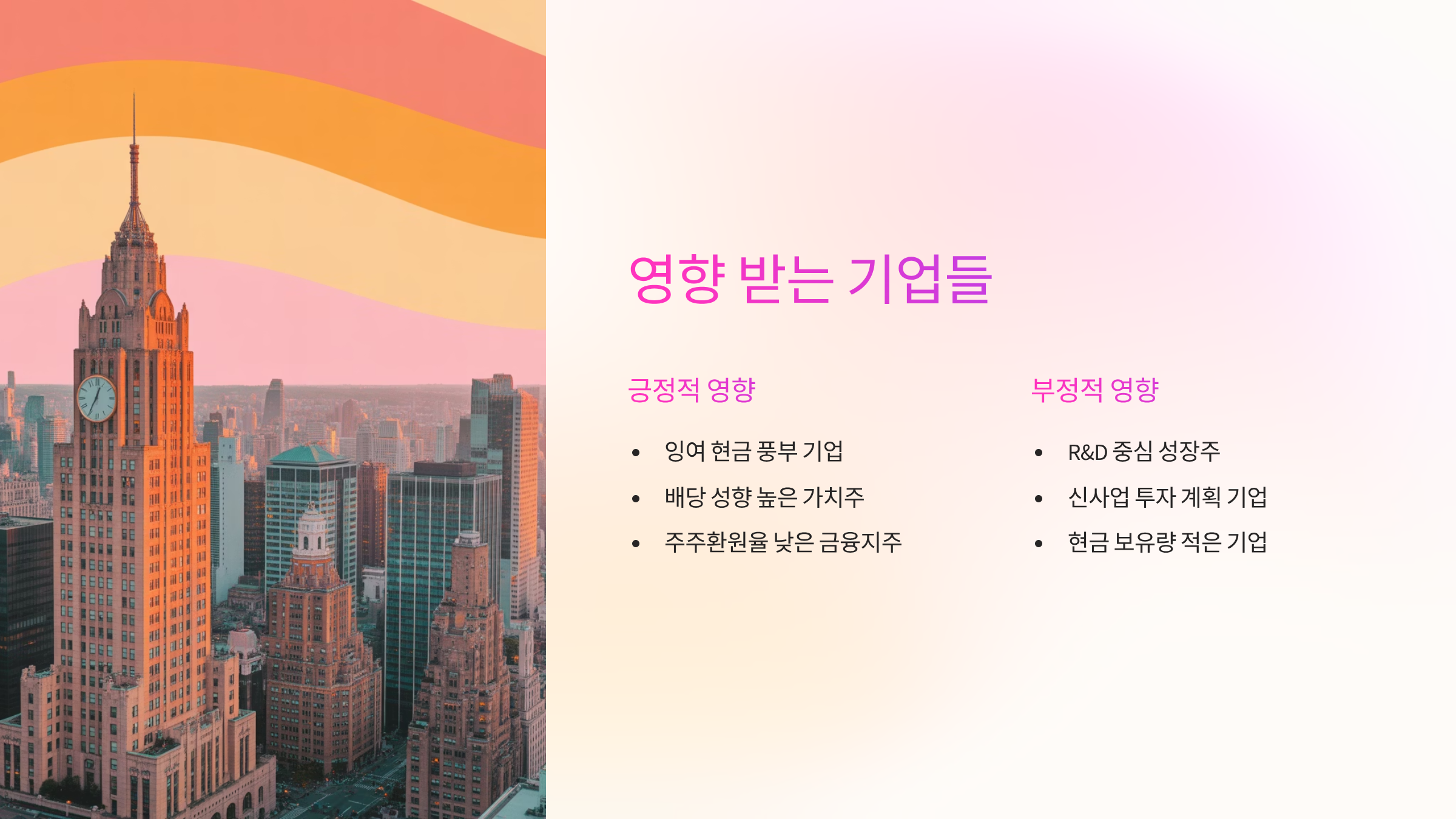 - 배당주의 상대적 부각: 자사주 소각이 배당과 유사한 주주환원 효과를 내기 때문에, 배당주의 투자 매력이 상대적으로 부각될 수 있습니다.