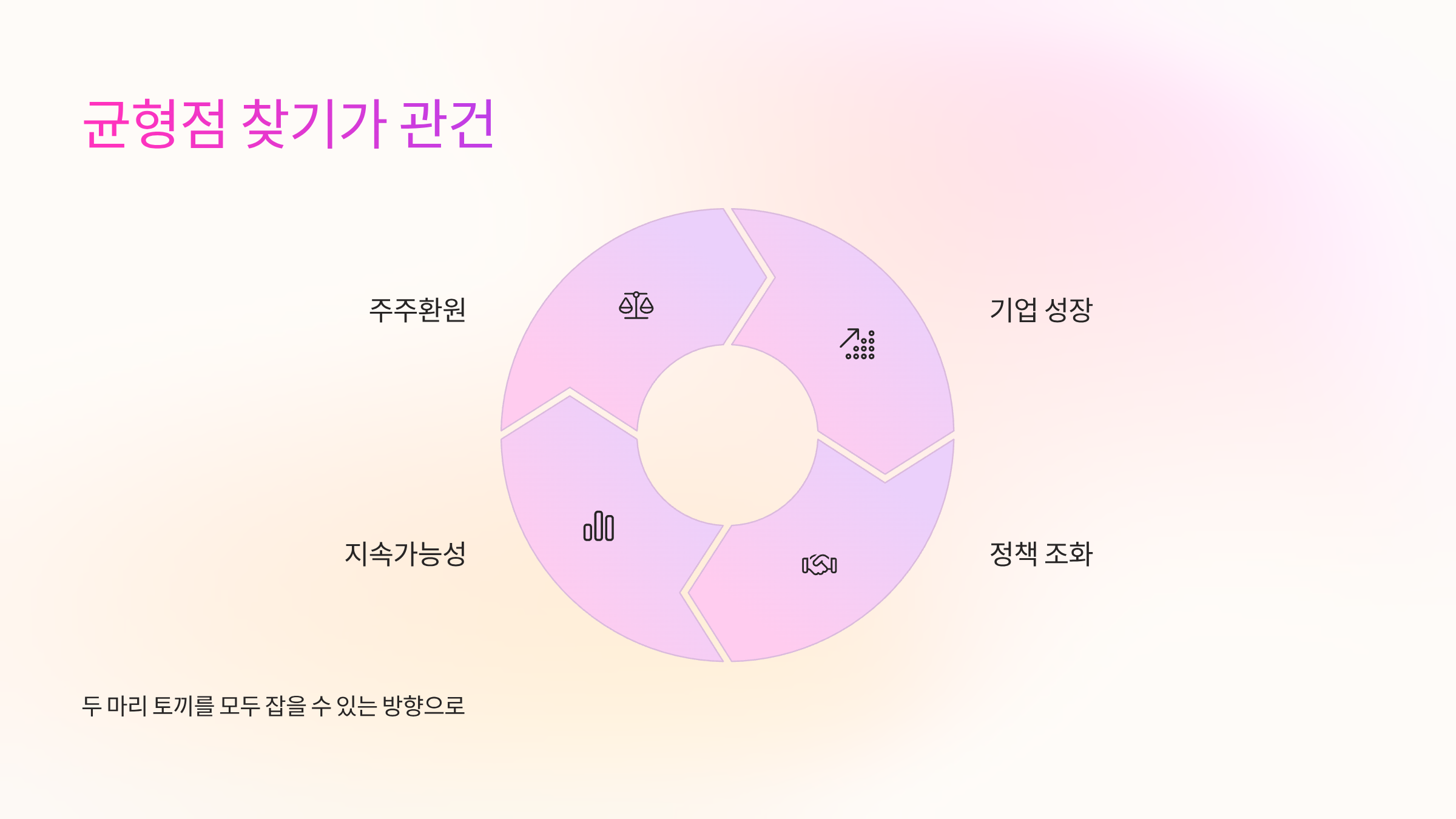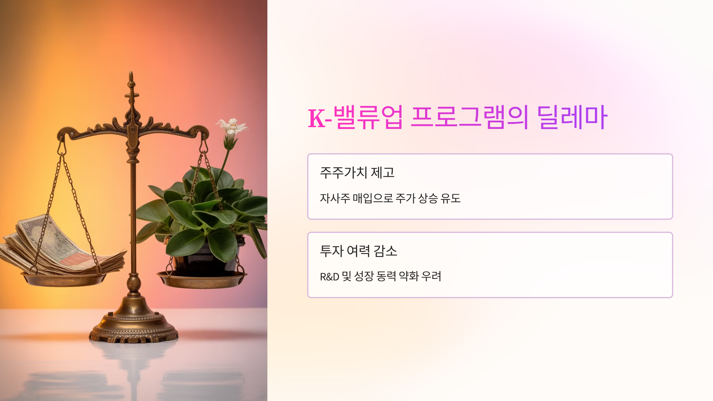 결국 밸류업 프로그램이 성공하기 위해서는 주주환원과 기업의 지속 가능한 성장이라는 두 마리 토끼를 모두 잡을 수 있는 균형점을 찾아야 합니다. 기업에게 일률적인 자사주 의무 소각을 강제하기보다는, 자율적인 의사결정을 존중하고 투자 인센티브를 제공하는 방향으로 정책을 보완해야 할 것입니다.