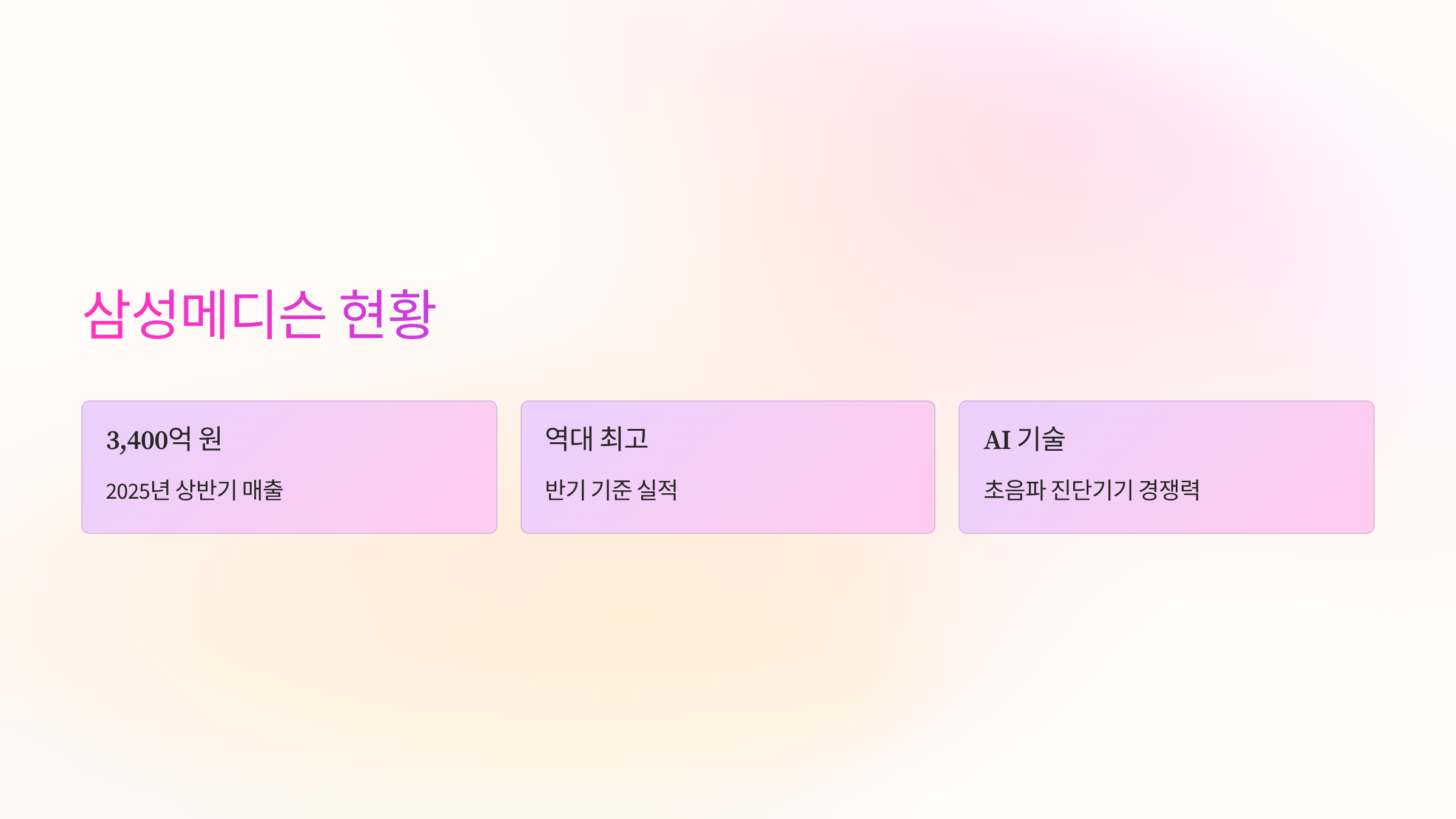 삼성메디슨은 2025년 상반기 매출 3,400억 원을 달성하며, 반기 기준 역대 최고 실적을 기록했습니다. 이는 의료기기 시장의 성장과 삼성메디슨의 초음파 진단기기 기술력이 결합된 결과입니다. 초음파 진단기기 시장은 고령화와 만성질환 증가로 꾸준히 성장하고 있으며, 삼성메디슨은 AI 기반 진단 기술 등 첨단 기술 투자를 통해 경쟁력을 강화해왔습니다.