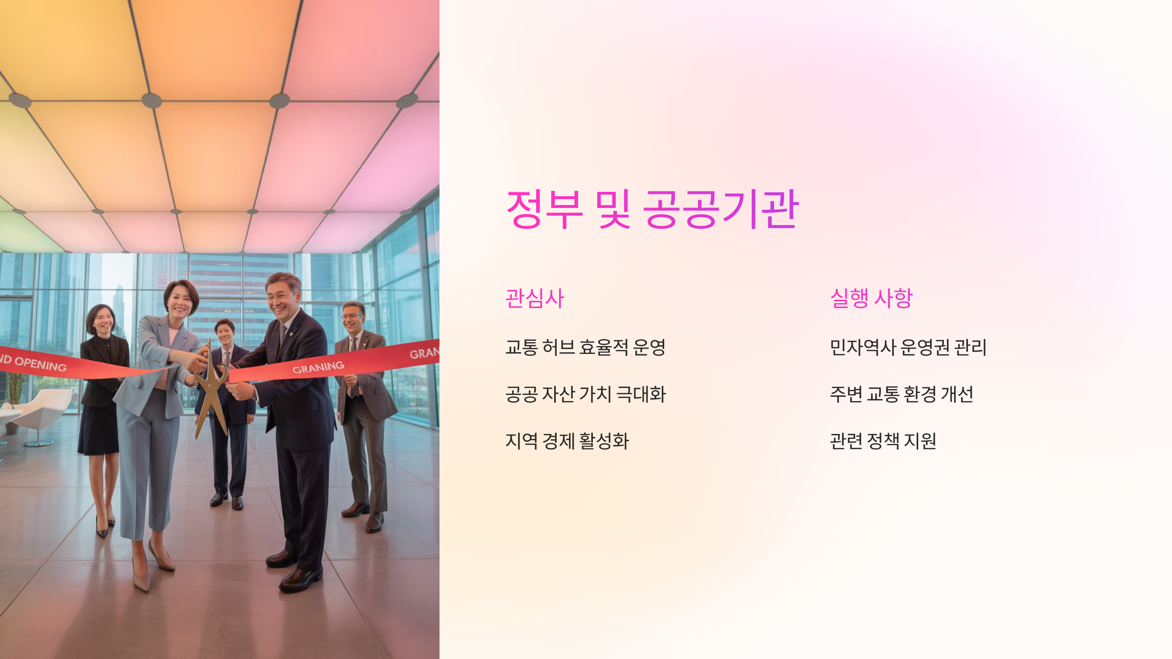 - 관심사 및 요구사항: 교통 허브의 효율적인 운영, 공공 자산의 가치 극대화, 지역 경제 활성화, 국민 편의 증진.