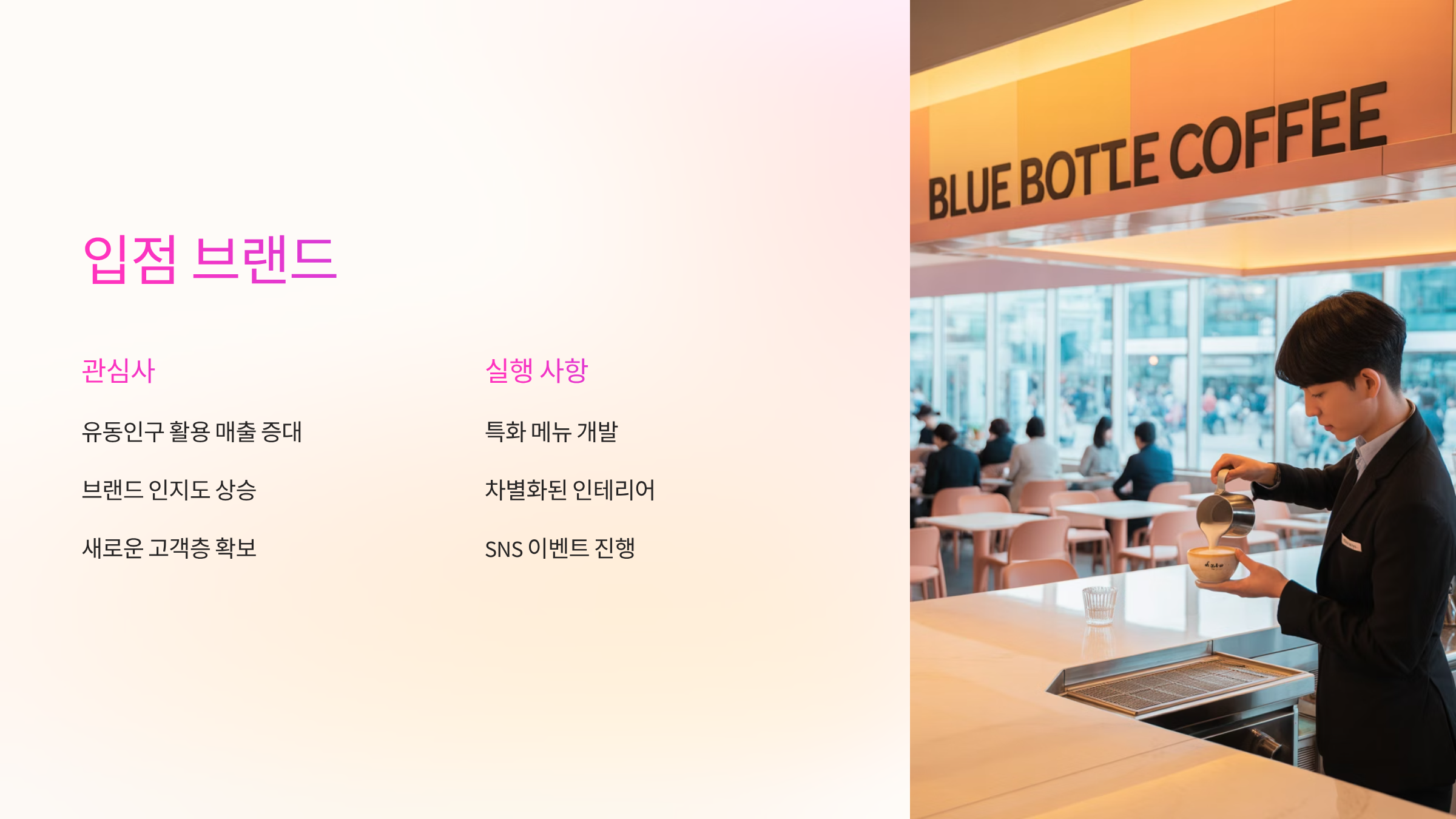 - 지향 방향: 서울역 상권의 핫플레이스 이미지 활용, 고객 접점 확대, SNS 바이럴 효과 극대화.