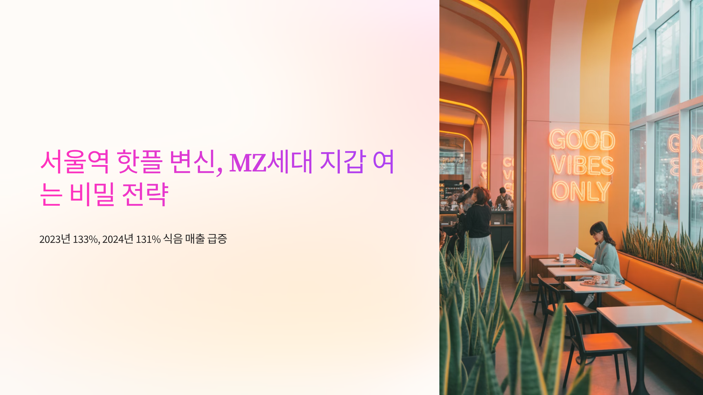 "서울역은 그냥 기차 타러 가는 곳 아니었어?" 혹시 당신도 이렇게 생각하고 계셨나요? 바쁜 출근길, 설레는 여행길, 혹은 잠시 스쳐 지나가는 경유지로만 여겨졌던 서울역이 이제는 젊은이들의 '핫플'로 떠오르고 있습니다. 과거의 낡고 칙칙한 기차 대합실 이미지를 벗어던지고, 2030세대에게 사랑받는 트렌디한 공간으로 탈바꿈한 서울역의 변화는 단순한 리뉴얼을 넘어섭니다. 2023년 전년 대비 133% 급증에 이어, 2024년에도 전년 대비 131% 증가라는 놀라운 식음 부문 매출 성장률은 이 변화가 얼마나 강력한지 보여주는 증거입니다.