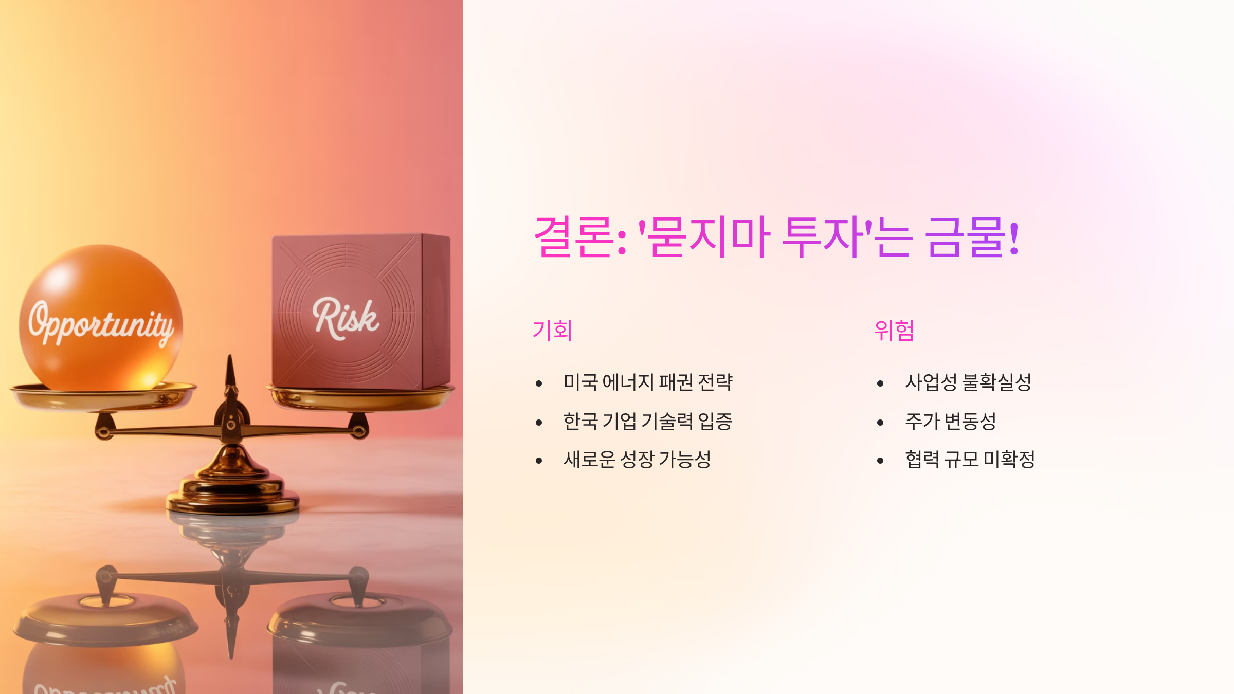 - 리스크 요인: 사업성 불확실성, 실제 계약 성사 여부, 주가 변동성, 미국 내 노동 비용 및 규제 리스크.