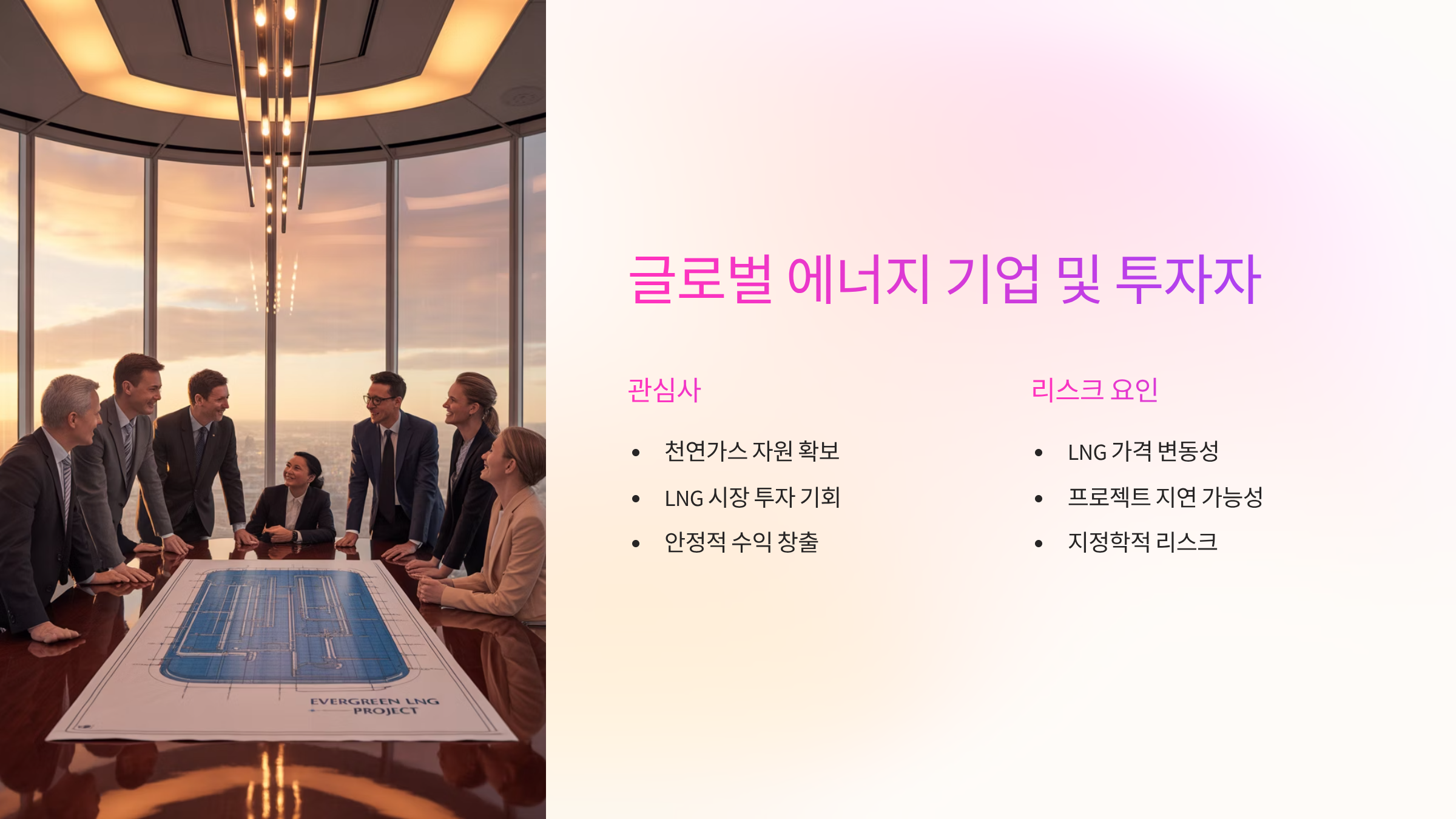 - 관심사 및 요구사항: 천연가스 자원 확보, LNG 시장 투자 기회, 안정적인 수익 창출.