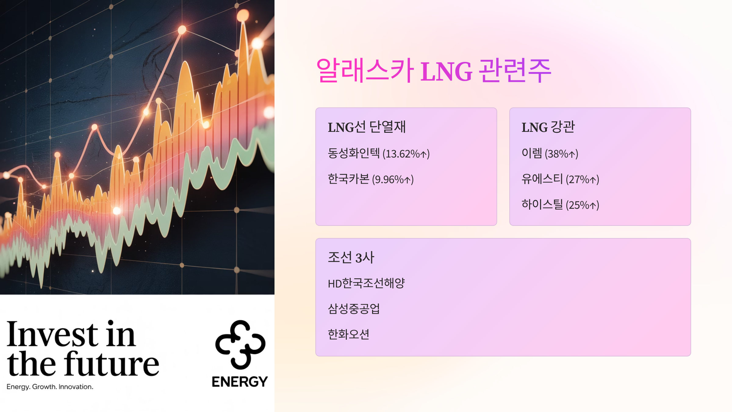 #LNG #LNG관련주 #알래스카LNG #동성화인텍 #한국카본 #태광 #이렘 #유에스티 #하이스틸 #에너지인프라 #가스관 #LNG선 #단열재 #강관 #조선주 #에너지안보 #트럼프정책 #투자전략 #주식투자 #핫이슈관련주 #K-조선 #K-플랜트