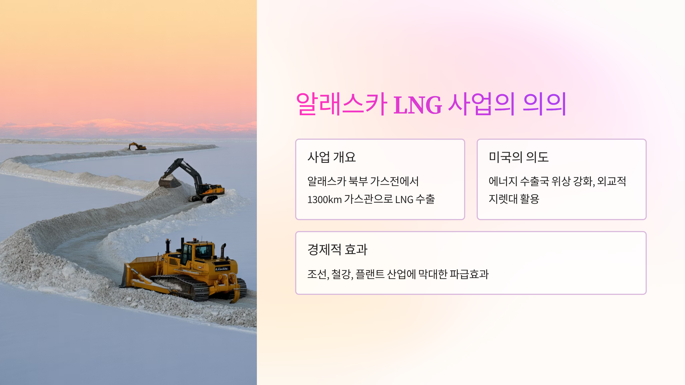 - 지향 방향: 미국의 알래스카 LNG 사업 참여를 통해 LNG선 및 강관, 기자재 등 국내 에너지 인프라 관련 산업 활성화.