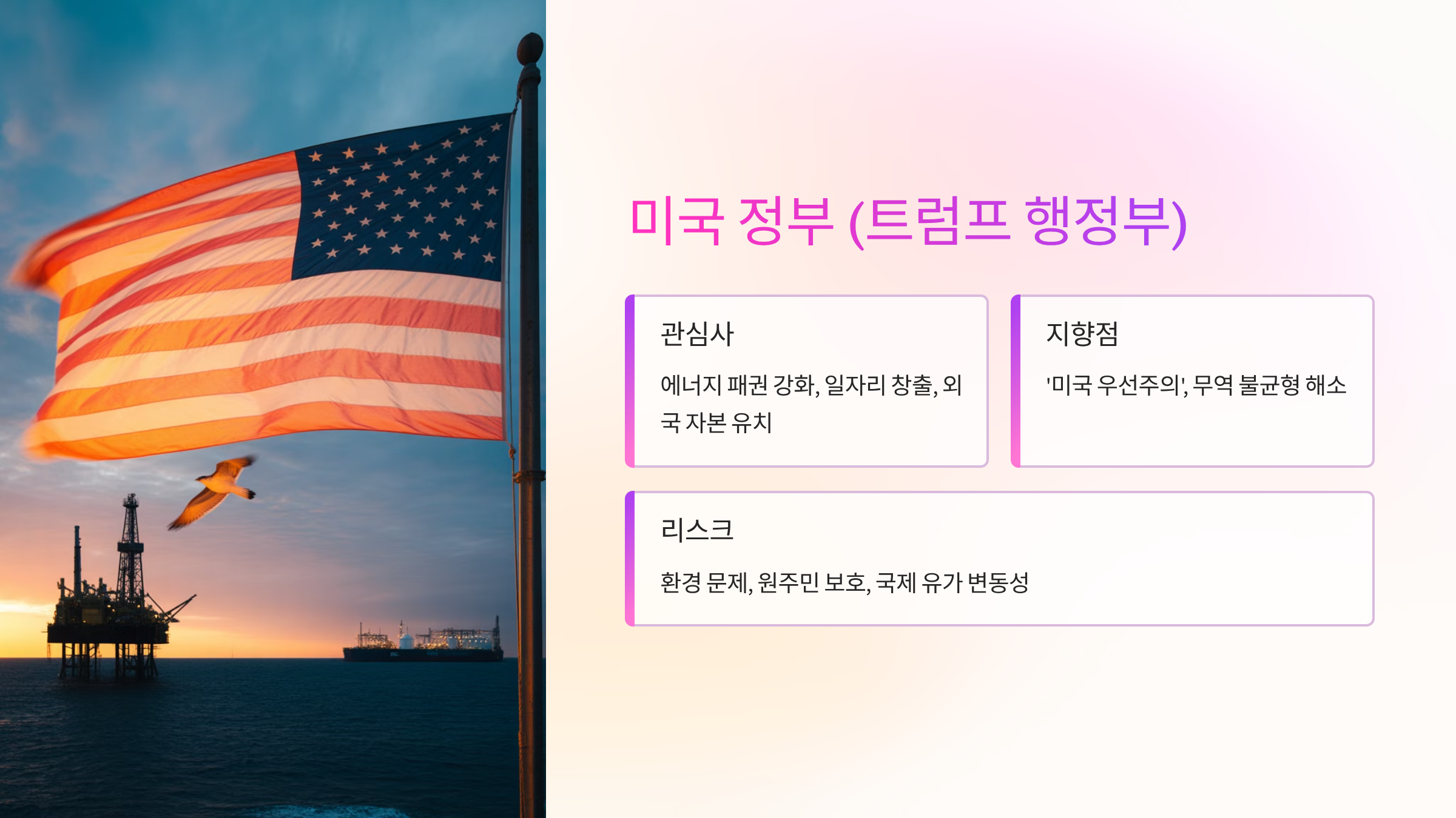 - 관심사 및 요구사항: 에너지 패권 강화, 미국 내 일자리 창출, 외국 자본 유치, 에너지 수출국으로서의 위상 제고.