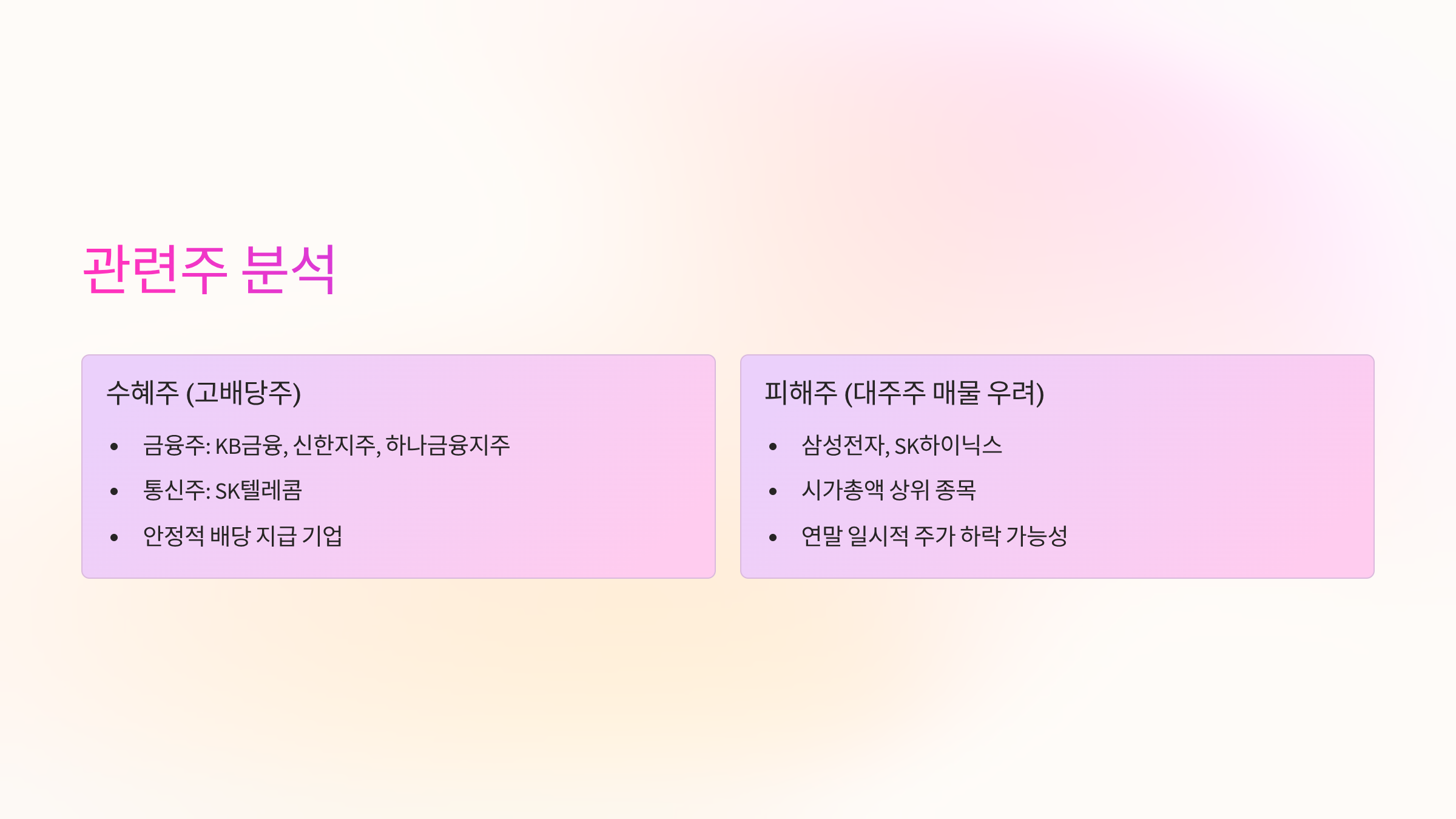 - 예시: KB금융, 신한지주, 하나금융지주 등 주요 금융지주사와 SK텔레콤 등 통신주