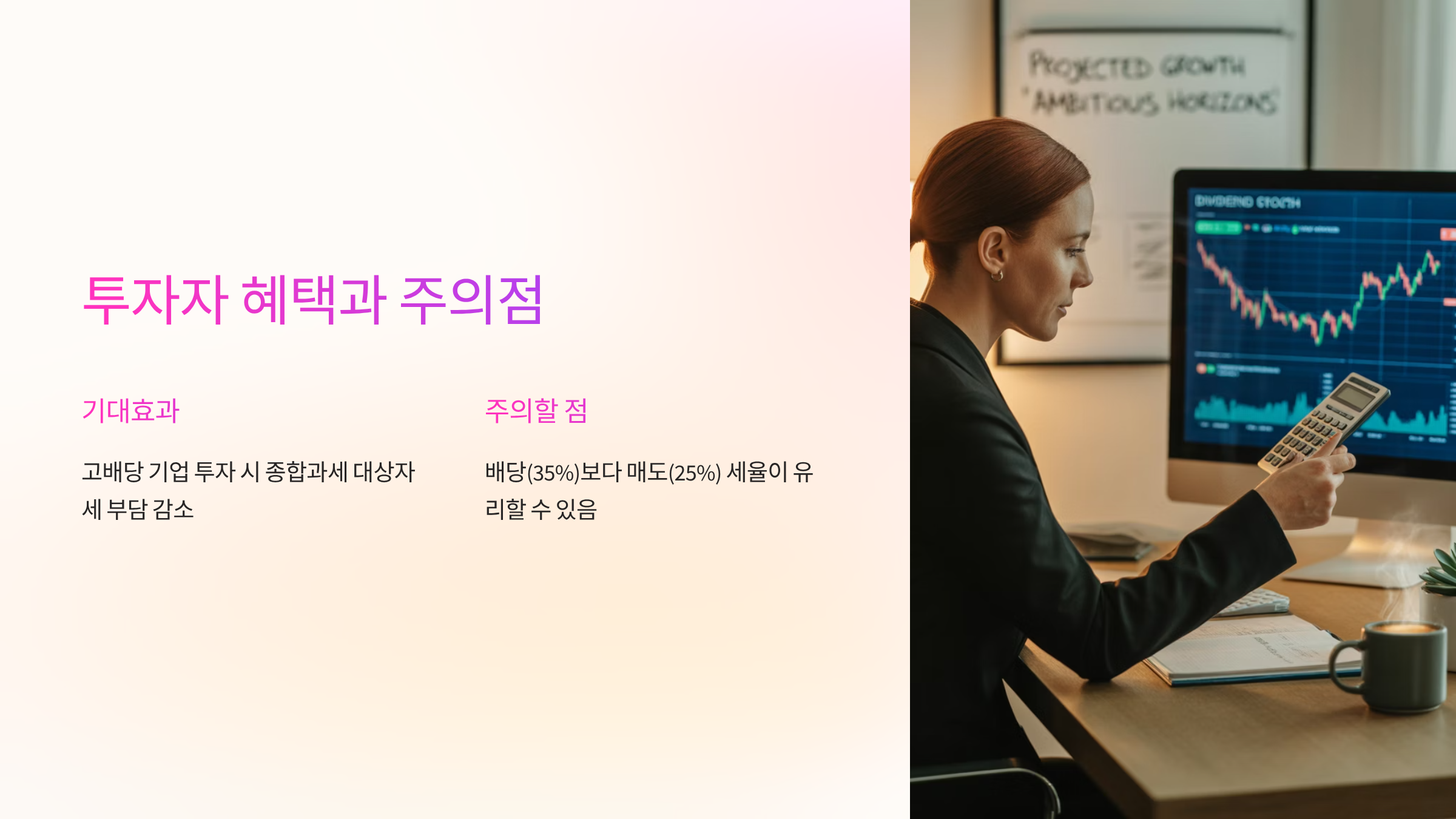 이번 세제개편안은 투자자들에게 다음과 같은 혜택과 주의할 점을 동시에 안겨줍니다.