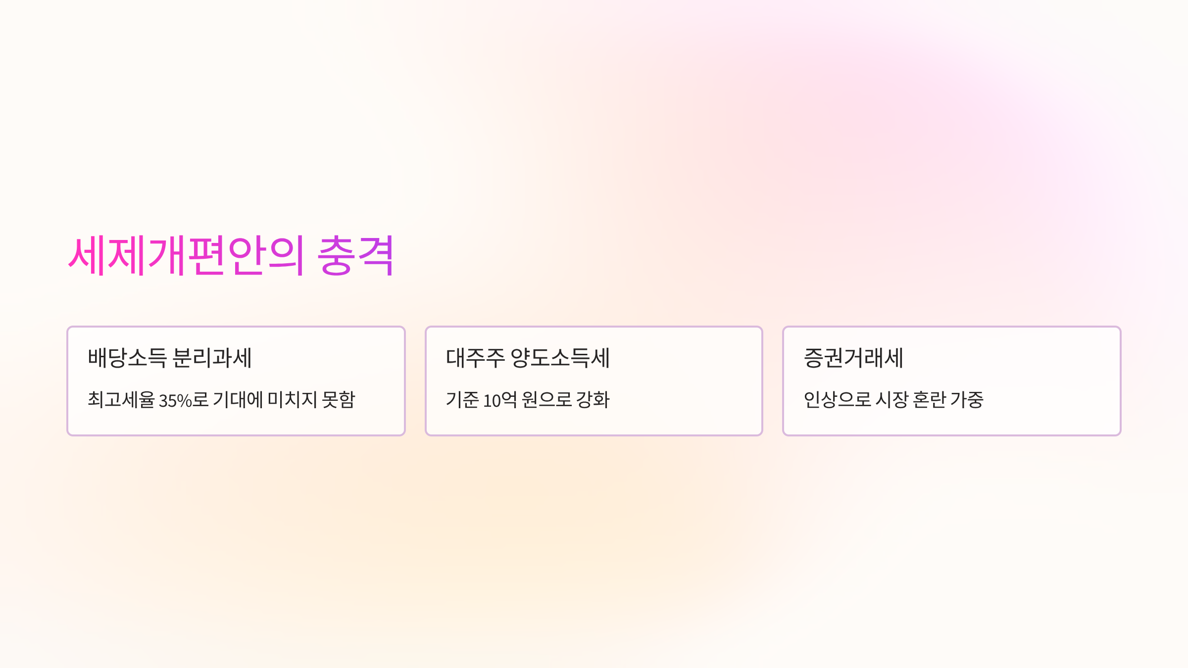 - 개인 투자자: 증권거래세 인상과 대주주 양도소득세 강화로 투자 비용과 세금 부담이 늘어났습니다. 배당소득 분리과세의 혜택을 온전히 누리기 어려운 상황이라 불만이 높습니다.